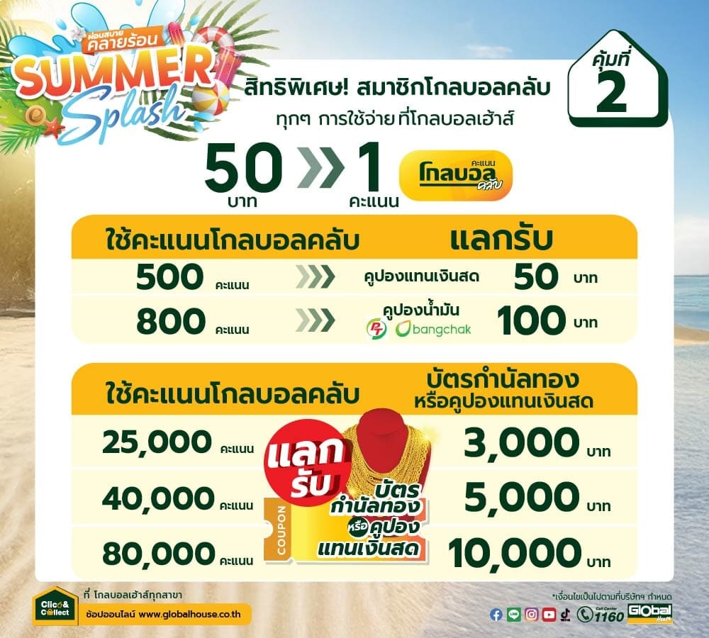 ทุกๆ การใช้จ่ายที่โกลบอลเฮ้าส์ 50 บาท รับ 1 คะแนนโกลบอลคลับ