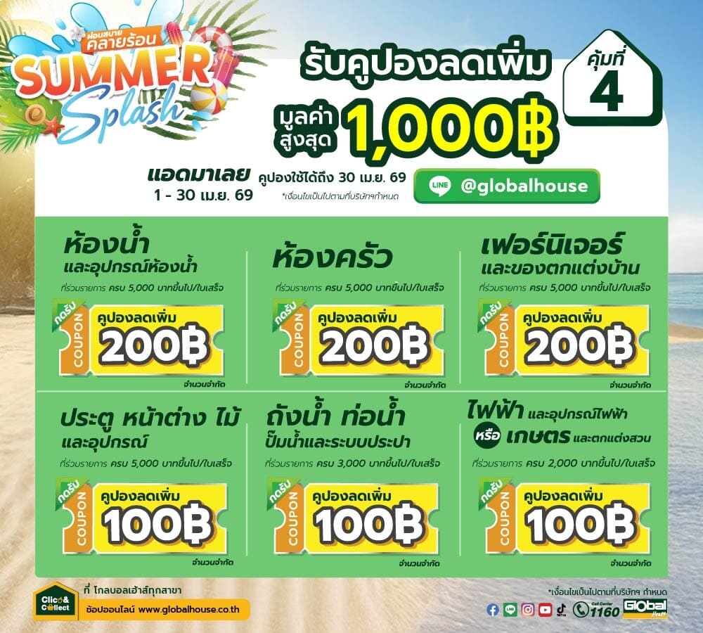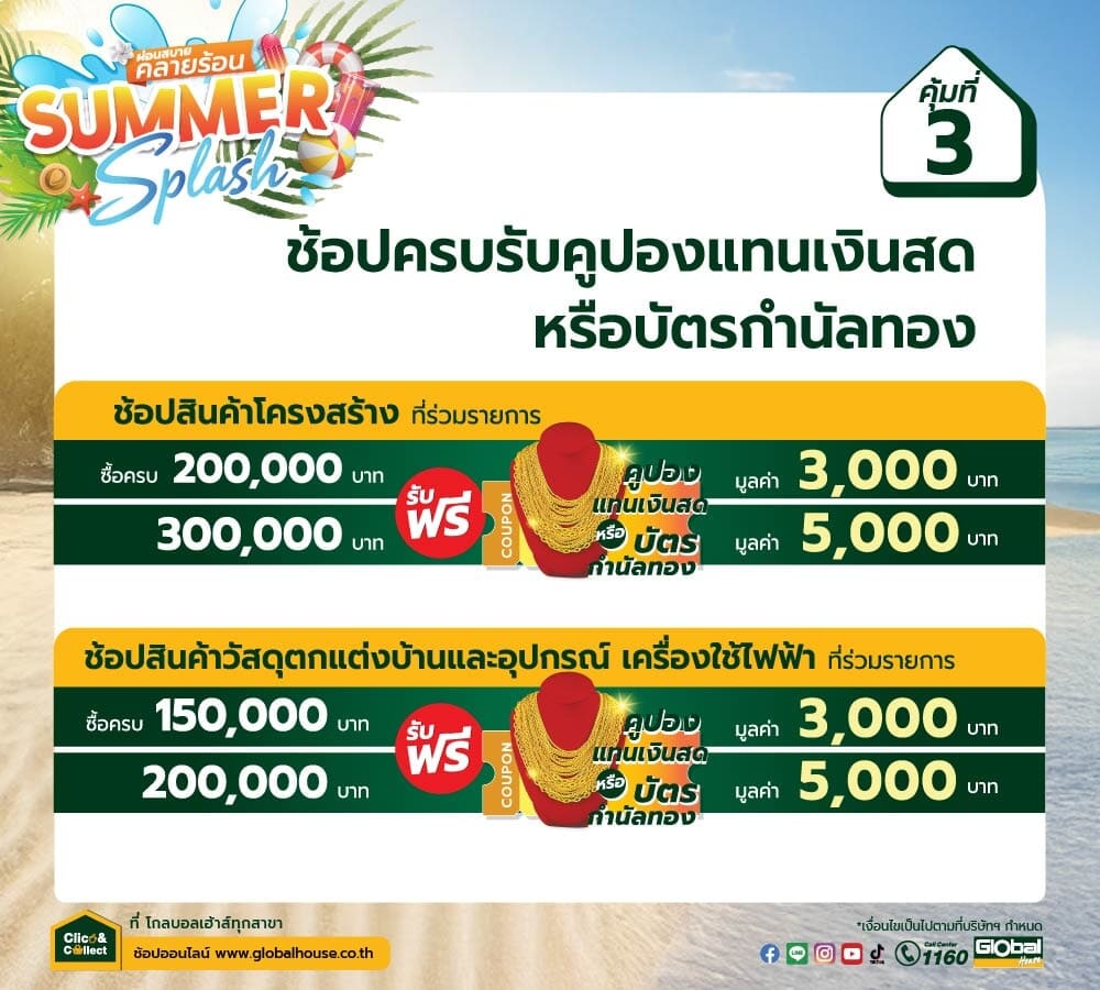 โกลบอลเฮ้าส์ มอบความคุ้มค่าถึงมือคุณ กับโปรโมชั่นสุดพิเศษประจำเดือนนี้! เพียงช้อปสินค้าปลีกและสินค้าโครงสร้างที่ร่วมรายการครบตามเงื่อนไข ก็รับไปเลยคูปองแทนเงินสดหรือบัตรกำนัลทองคำ มูลค่าสูงสุด 5,000 บาท ทันที