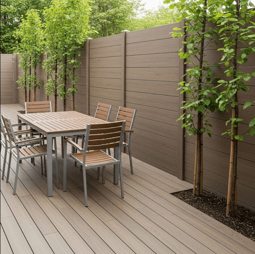 WPC มีความแข็งแรงและทนต่อแสงแดด ฝน และอุณหภูมิสูง เหมาะสำหรับตกแต่งผนังอาคารหรือระเบียง