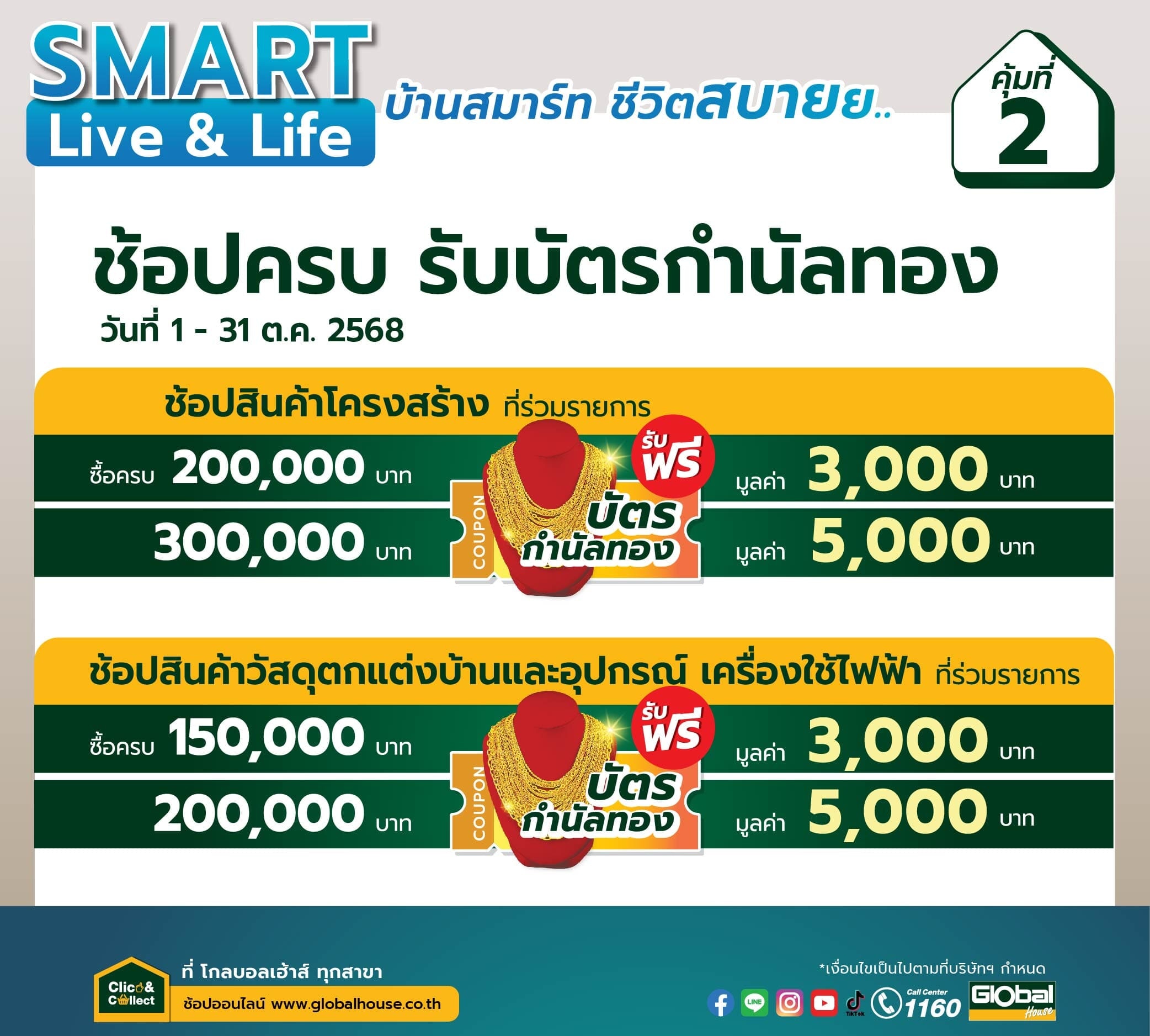 โกลบอลเฮ้าส์ มอบความคุ้มค่าถึงมือคุณ กับโปรโมชั่นสุดพิเศษประจำเดือนนี้! เพียงช้อปสินค้าปลีกและสินค้าโครงสร้างที่ร่วมรายการ ครบตามเงื่อนไข ก็รับไปเลย บัตรกำนัลทองคำ มูลค่าสูงสุด 5,000 บาท ทันที
