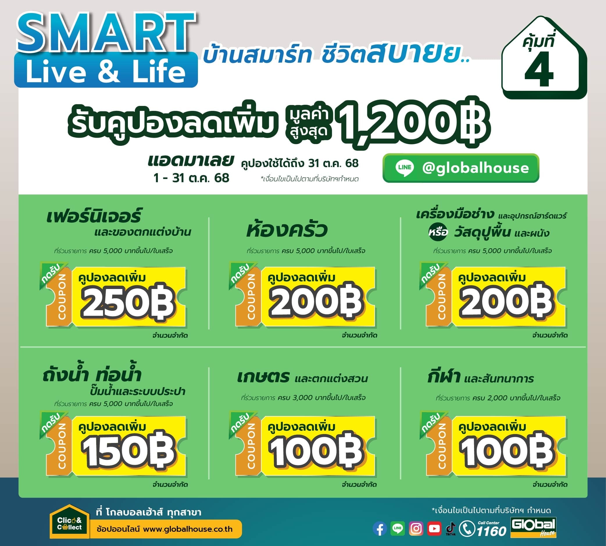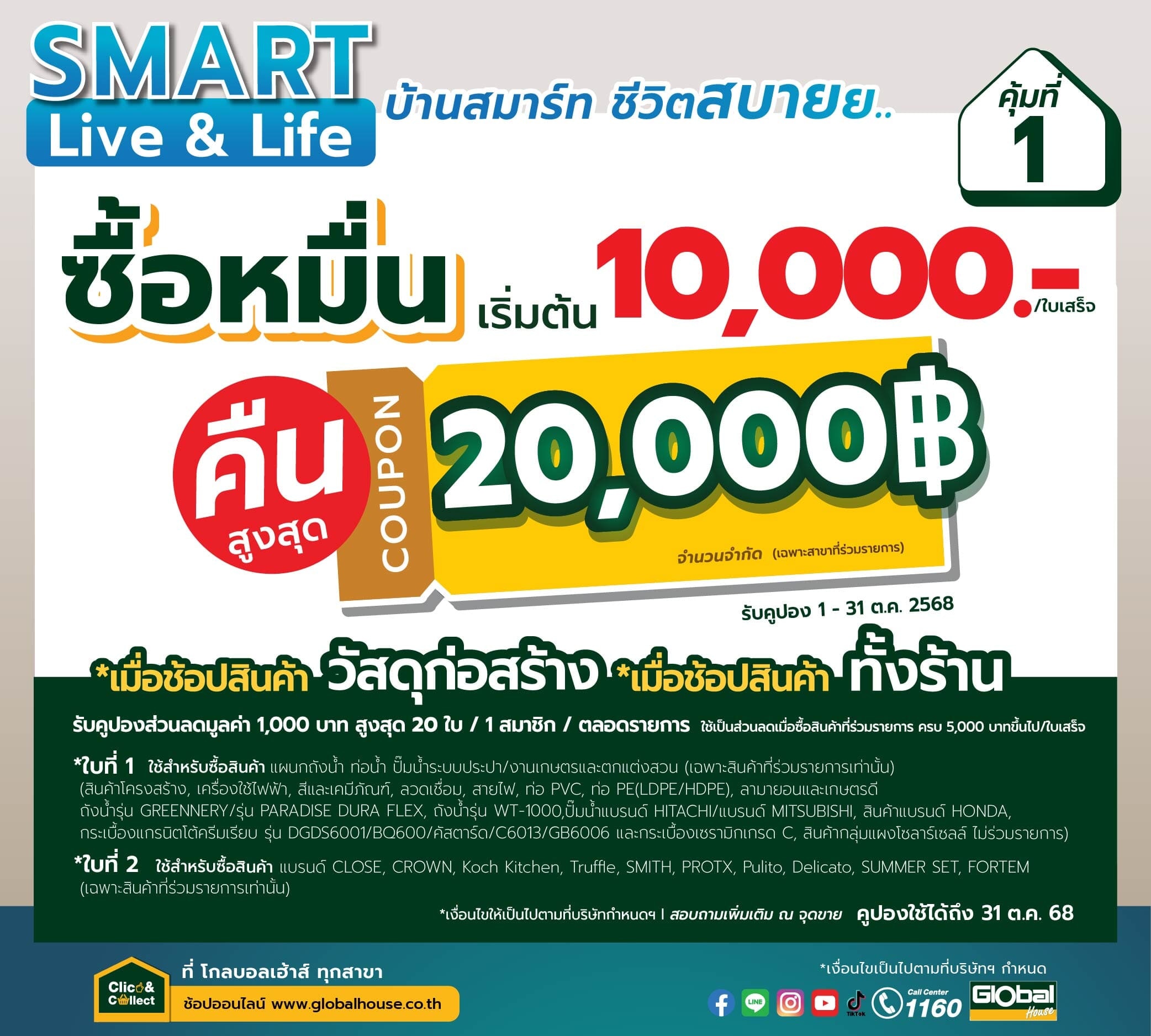 Smart Live & Life บ้านอยู่สบาย มัดรวมทุกไอเทมเพื่อบ้านและชีวิต ไม่ว่าจะเป็นเฟอร์นิเจอร์ชิ้นใหญ่, เครื่องใช้ไฟฟ้า, ชุดเครื่องครัว, ห้องน้ำและอุปกรณ์ห้องน้ำ, ไปจนถึงวัสดุก่อสร้างและของตกแต่งบ้าน ครบจบในที่เดียว ลดแรง คุ้มจริง เพื่อบ้านคุณ ที่ โกลบอลเฮ้าส์ ทุกสาขา มาพร้อมสิทธิพิเศษสุดคุ้มมากมาย ทั้งสินค้าราคาพิเศษ รับคูปองคืน และของสมนาคุณอีกเพียบ! หากคุณกำลังมองหาโปรโมชั่นวัสดุก่อสร้างหรือของแต่งบ้าน นี่คือโอกาสที่ไม่ควรพลาด