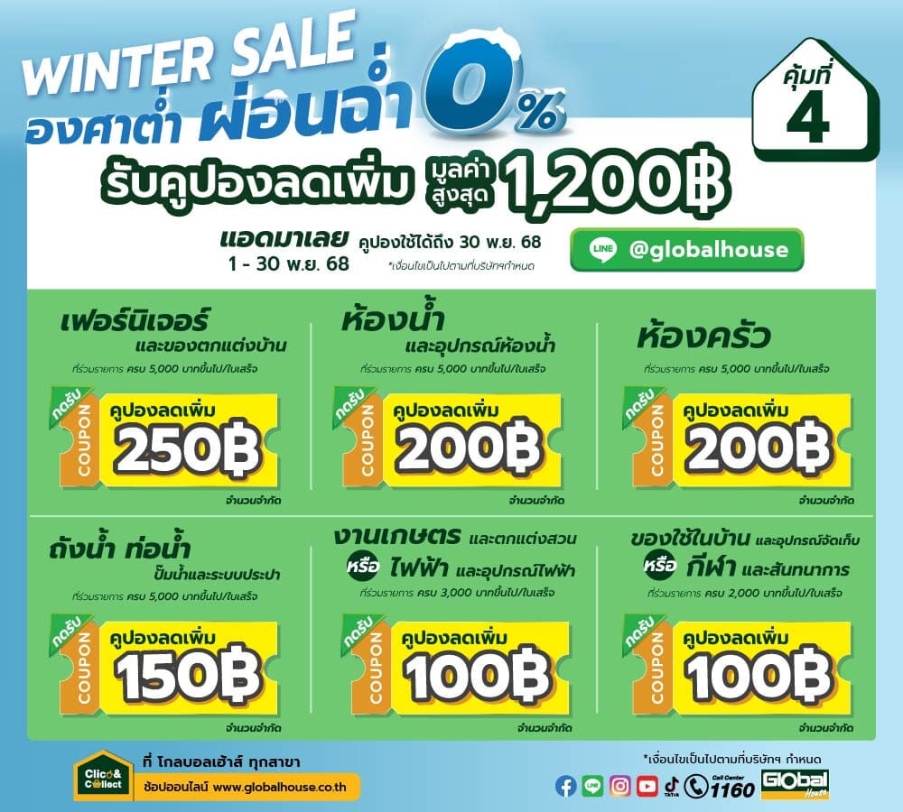 โกลบอลเฮ้าส์ แจกคูปองจัดเต็ม! แค่คุณเป็นสมาชิก โกลบอลคลับ และเพิ่มเพื่อน LINE @globalhouse หรือใช้แอปพลิเคชัน Click&Collect ก็รับคูปองส่วนลดเพิ่มทันที มูลค่าสูงสุดถึง 1,200 บาท