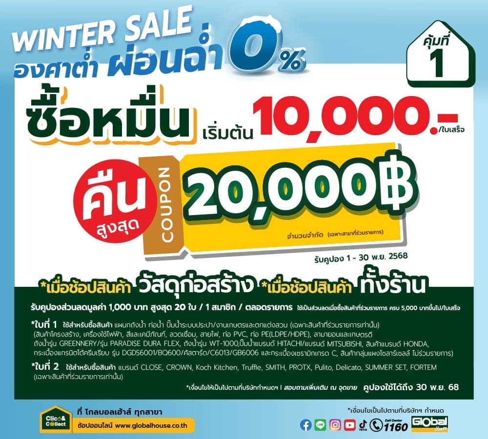 แจกคูปองจัดเต็ม! ช้อปครบ รับส่วนลดสูงสุด 20,000 บาท ที่โกลบอลเฮ้าส์