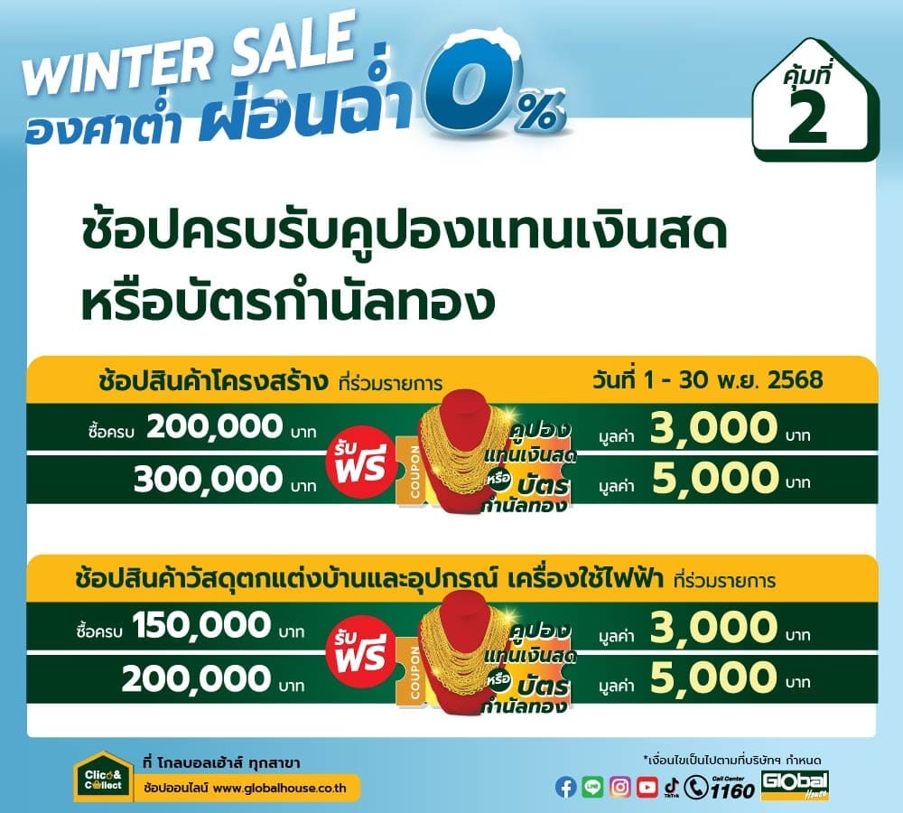 โกลบอลเฮ้าส์ มอบความคุ้มค่าถึงมือคุณ กับโปรโมชั่นสุดพิเศษประจำเดือนนี้! เพียงช้อปสินค้าปลีกและสินค้าโครงสร้างที่ร่วมรายการครบตามเงื่อนไข ก็รับไปเลยคูปองแทนเงินสดหรือบัตรกำนัลทองคำ มูลค่าสูงสุด 5,000 บาท ทันที