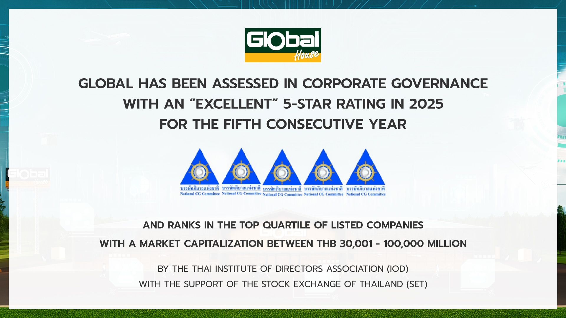 Siam Global House Public Company Limited (“GLOBAL”) has been awarded a 5-Star “Excellent” rating in the 2025 Corporate Governance Report of Thai Listed Companies (CGR 2025) for the fifth consecutive year, and ranked among the Top Quartile of listed companies with a market capitalization between THB 30,001–100,000 million organized by the Thai Institute of Directors Association (IOD), in an assessment conducted by the Thai Institute of Directors Association (IOD), with the support of The Stock Exchange of Thailand (SET) and the Securities and Exchange Commission, Thailand (SEC).
