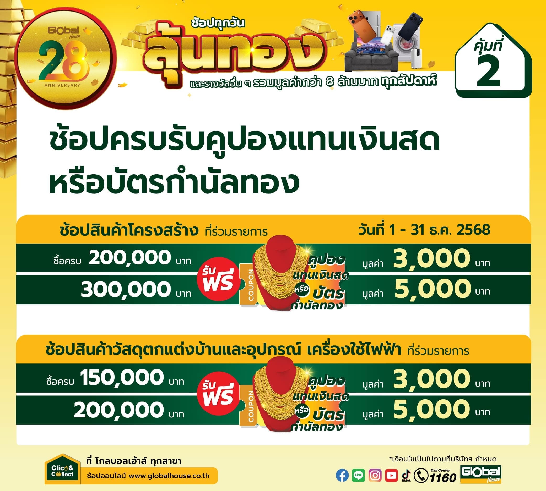 โกลบอลเฮ้าส์ มอบความคุ้มค่าถึงมือคุณ กับโปรโมชั่นสุดพิเศษประจำเดือนนี้! เพียงช้อปสินค้าปลีกและสินค้าโครงสร้างที่ร่วมรายการครบตามเงื่อนไข ก็รับไปเลยคูปองแทนเงินสดหรือบัตรกำนัลทองคำ มูลค่าสูงสุด 5,000 บาท ทันที