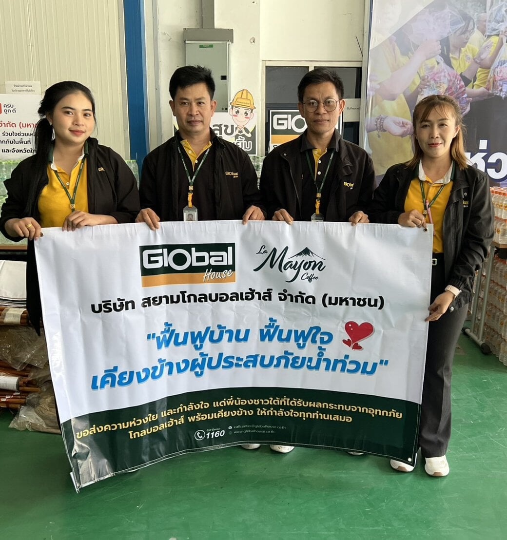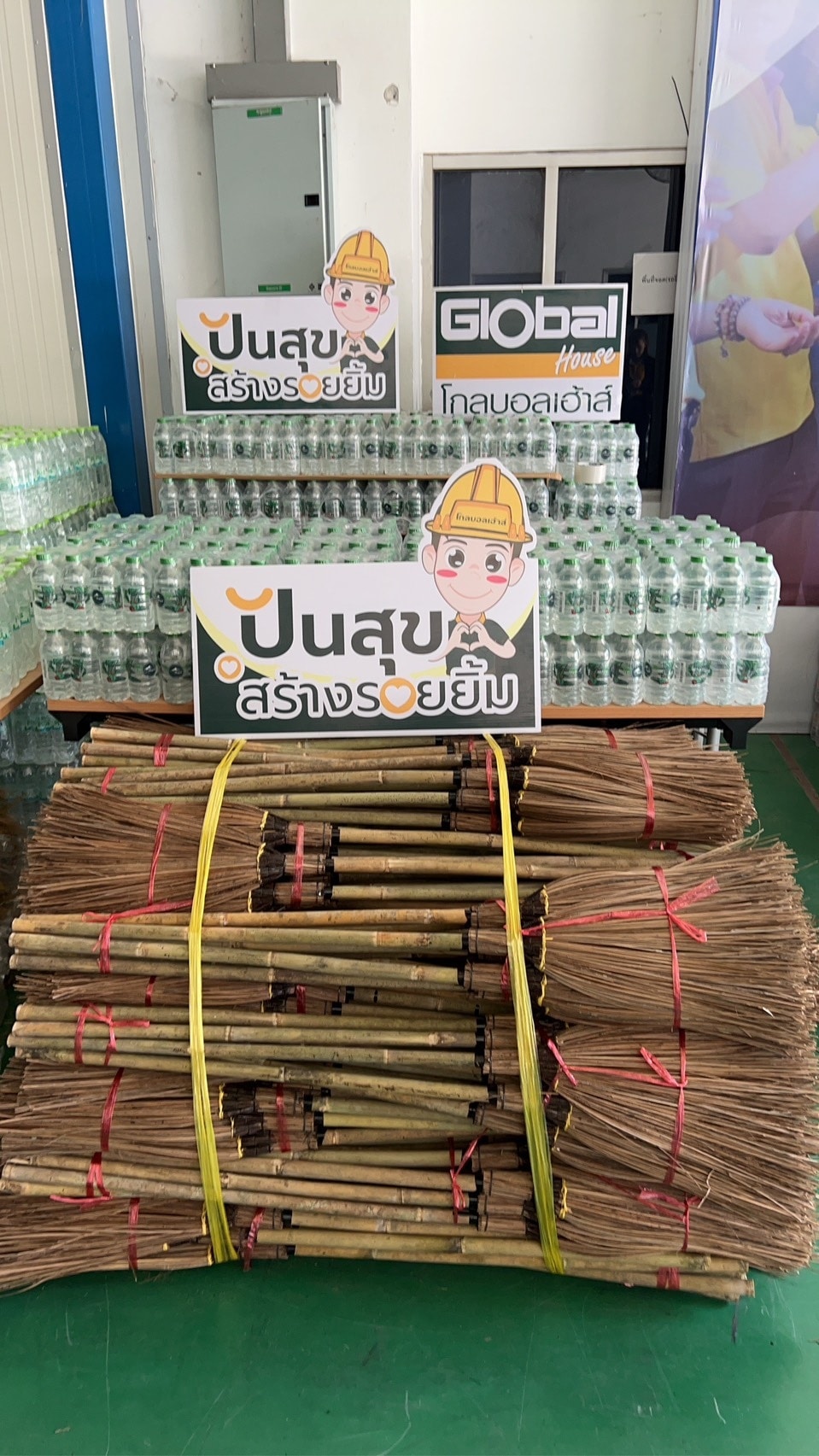 โดยมีการระดมกำลังอาสาจากพนักงานโกลบอลเฮ้าส์ ร่วมเตรียมสิ่งของอุปโภคบริโภค อาทิ น้ำดื่มลามายอน จำนวน 200 แพ็ค และไม้กวาดทางมะพร้าว จำนวน 1,000 ชิ้น เพื่อส่งต่อความช่วยเหลืออย่างเร่งด่วนสู่พื้นที่ภัยพิบัติ