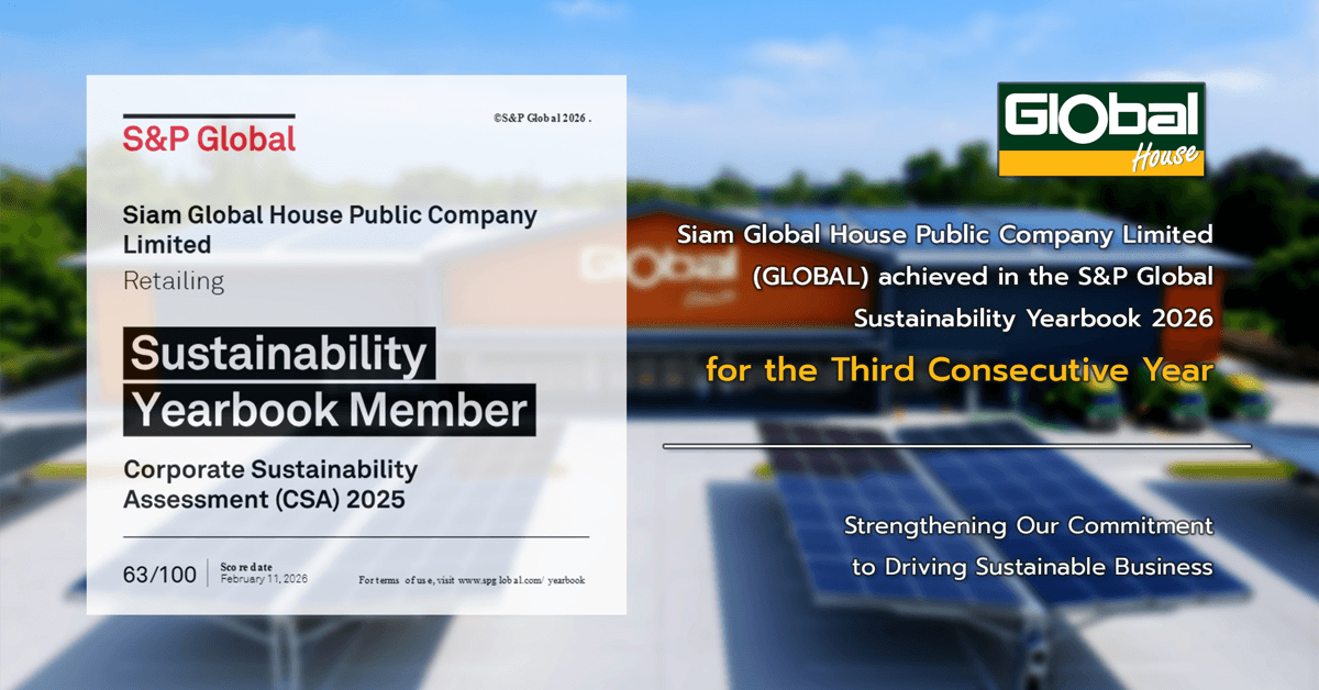 Siam Global House Public Company Limited (GLOBAL) achieved in the S&P Global Sustainability Yearbook 2026 for the third consecutive year in the Retailing industry, highlighting the company’s continued commitment to international sustainability standards.