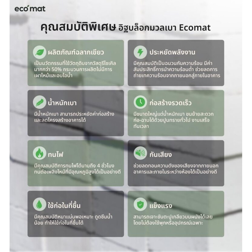 ซึ่งช่วยให้เกิดการใช้ทรัพยากรอย่างยั่งยืนและลดผลกระทบต่อสิ่งแวดล้อมในระยะยาวได้เป็นอย่างดี คุณสมบัติเฉพาะของอิฐบล็อกเบา ECOMAT