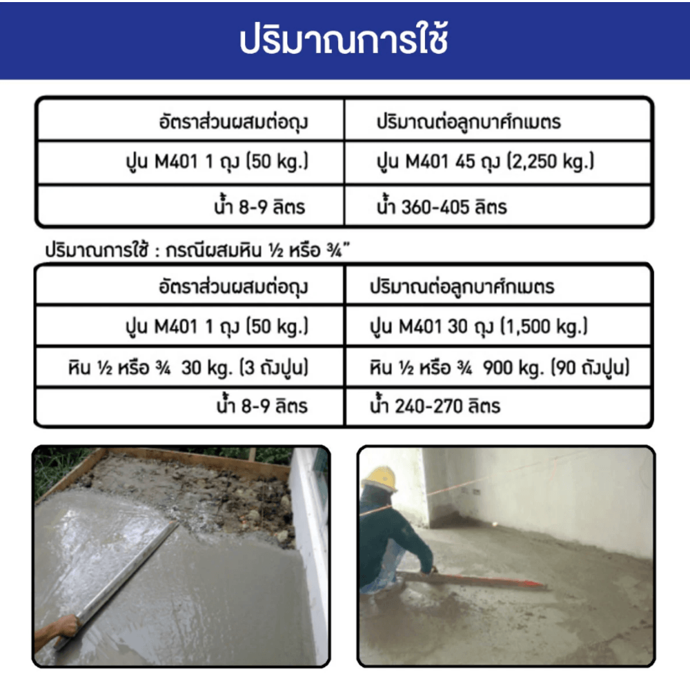 | รุ่น | M401 (คอนกรีตแห้งกำลังอัด 180 ksc.) 50 kg |