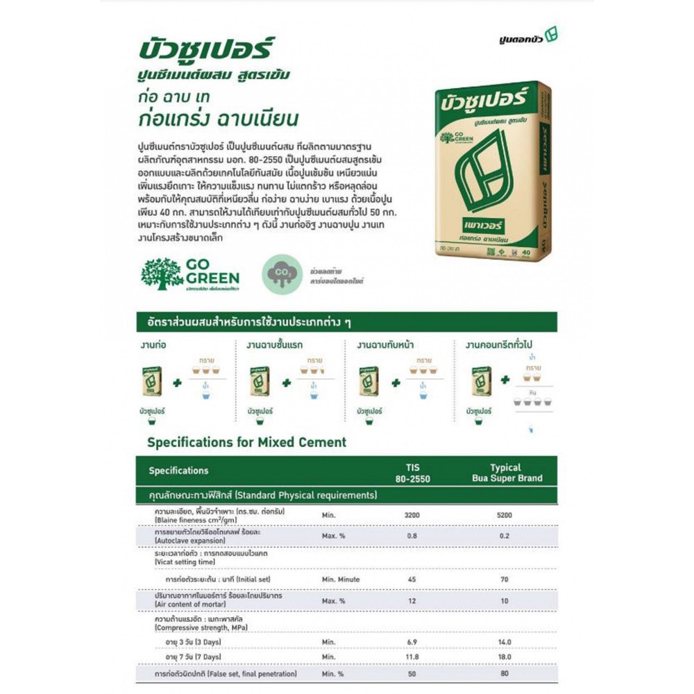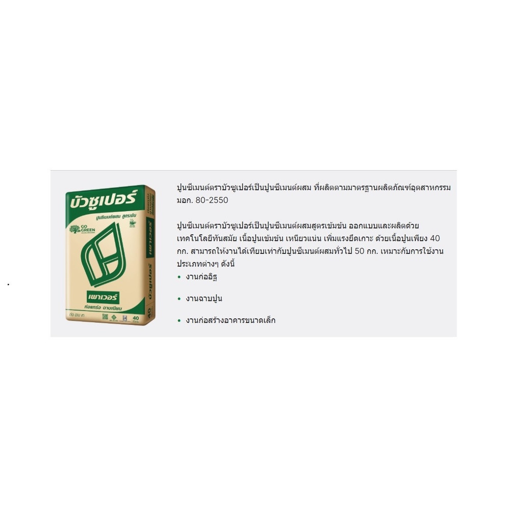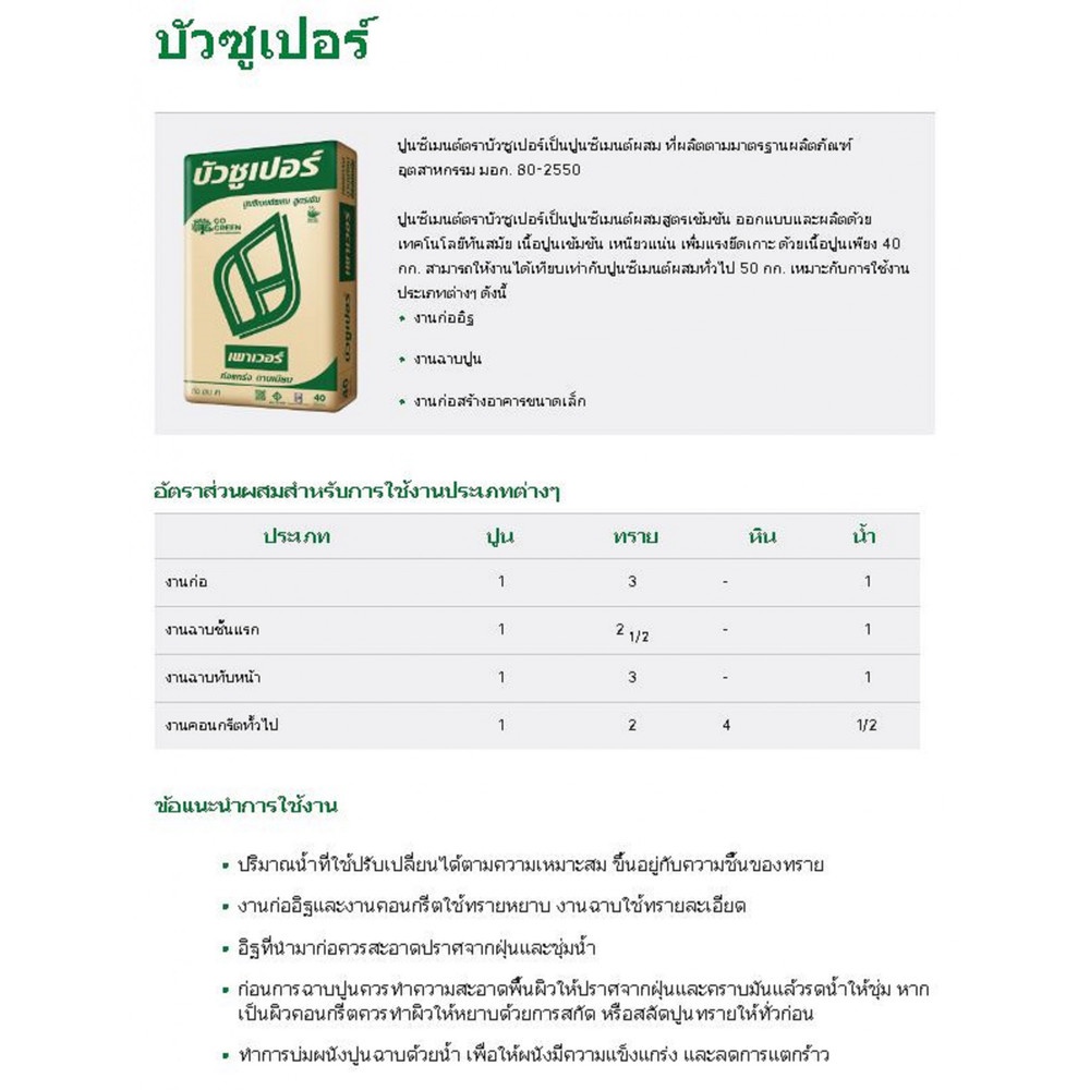 ปูนซีเมนต์ตราบัวซูเปอร์เป็นปูนซีเมนต์ผสม ที่ผลิตตามมาตรฐานผลิตภัณฑ์อุตสาหกรรม มอก. 80-2550 ปูนซีเมนต์ตราบัวซูเปอร์เป็นปูนซีเมนต์ผสมสูตรเข้มข้น ออกแบบและผลิตด้วยเทคโนโลยีทันสมัย เนื้อปูนเข้มข้น เหนียวแน่น เพิ่มแรงยึดเกาะ ด้วยเนื้อปูนเพียง 40 กก. สามารถให้งานได้เทียบเท่ากับปูนซีเมนต์ผสมทั่วไป 50 กก. เหมาะกับการใช้งานประเภทต่างๆ ดังนี้ งานก่ออิฐ งานฉาบปูน งานก่อสร้างอาคารขนาดเล็ก