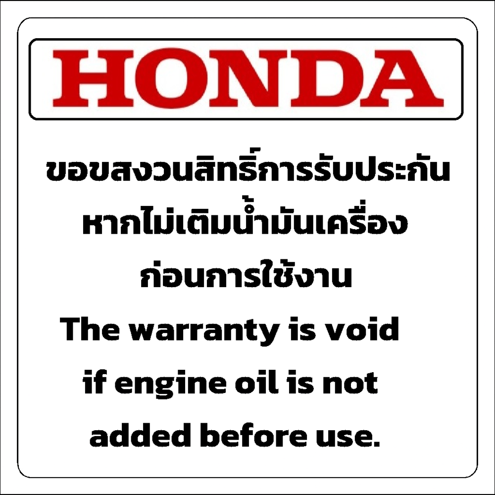 รับประกันคุณภาพ 1 ปี ในกรณีที่สินค้าผิดปกติจากการผลิต มิใช่เกินจาการใช้งานที่ไม่ถูกต้อง เช่น ลืมเติมน้ำมันเครื่อง หรือเติมไม่ถึงเกณฑ์ตามคู่มือ จะไม่สามารถเคลมได้ กรุณาทดสอบสินค้าให้เรียบร้อย สินค้ารับประกันจากผู้ผลิต ไม่สามารถเปลี่ยนเครื่องใหม่ได้ทันที กรณีเปลี่ยนเครื่องใหม่ต้องได้รับการตรวจเช็คจากผู้เชี่ยวชาญของ บ.ไทยฮฮนด้า จำกัด ก่อนเท่านั้น