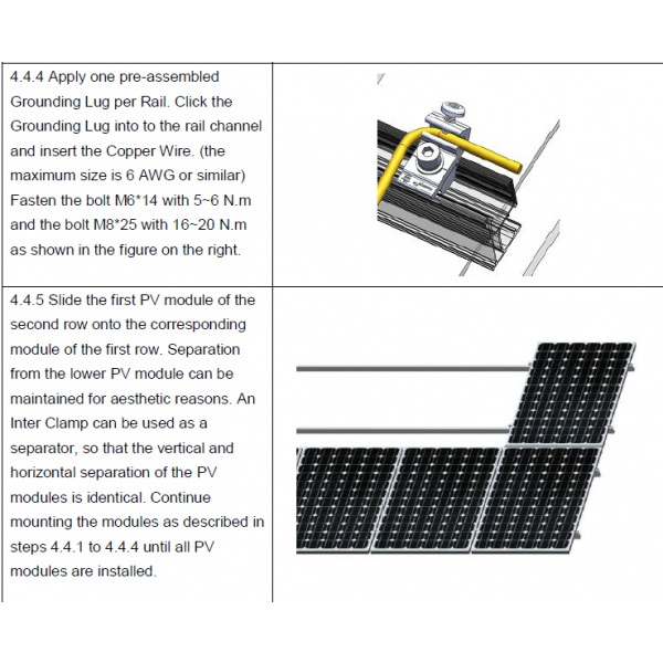 3. ขันโบลต์ M6*14 ด้วย 5~6 N.m และโบลต์ M8*25 ที่มี 16~20 N.m ดังแสดงในรูปด้านขวา เลื่อนโมดูล PV แรกของแถวที่สองไปยังโมดูลที่สอดคล้องกันของแถวแรก