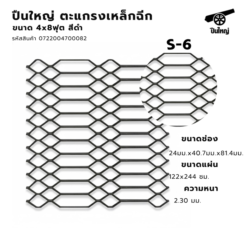 ตะแกรงเหล็กฉีกปืนใหญ่ รุ่น S-6 เป็นรุ่นที่เน้นความเรียบและปลอดภัยในการใช้งาน เหมาะสำหรับงานตกแต่ง งานพื้นทางเดิน หรืองานที่ต้องการผิวสัมผัสเรียบเพื่อป้องกันการสะดุดหรือบาดเจ็บ ตัวแผ่นผ่านกระบวนการรีดเรียบ (Flattened) หลังการฉีก จึงมีความหนาแน่นและแข็งแรงสม่ำเสมอทั่วทั้งผืน พร้อมเคลือบผิวสีดำเพื่อป้องกันสนิม เหมาะกับการใช้งานทั้งภายในและภายนอกอาคาร