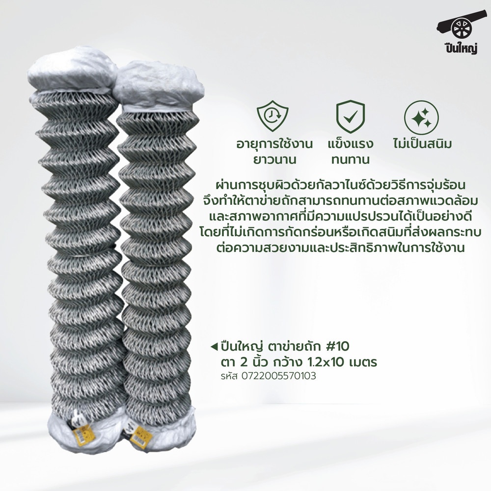 ปืนใหญ่ ตาข่ายถัก (Chain link fence) ผลิตจากลวดเหล็กชุบกัลวาไนซ์นำมารีดเส้น และขึ้นรูปโดยใช้เครื่องจักรสำหรับผลิตตาข่ายถัก ร้อยเกลียวกันไปมา เป็นลักษณะสี่เหลี่ยมข้าวหลามตัด ซึงเป็นเอกลักษณ์ของตาข่ายชนิดนี้ เคลือบผิวด้วยการชุบกัลวาไนซ์ มีอายุการใช้งานยาวนาน นิยมนำมา รั้วประเภทต่างๆ เหมาะสำหรับใช้งานในบ้านพักอาศัย พื้นที่เกษตร ฟาร์ม โรงงาน และสนามกีฬา มีอายุการใช้งานที่ยาวนานหลายสิบปี ผ่านกระบวนการผลิตจากวัสดุคุณภาพสูง และมีการชุบผิวด้วยกัลวาไนซ์ ด้วยวิธีการจุ่มร้อน จึงทำให้ตาข่ายถักสามารถทนทานต่อสภาพแวดล้อมและสภาพอากาศที่มีความแปรปรวนได้เป็นอย่างดี โดยที่ไม่เกิดการกัดกร่อนหรือเกิดสนิมที่ส่งผลกระทบต่อความสวยงามและประสิทธิภาพในการใช้งาน