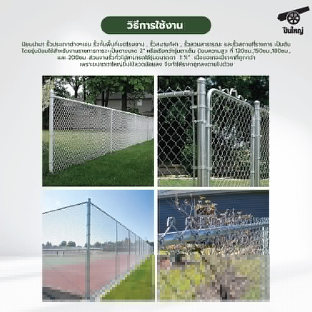 ปืนใหญ่ ตาข่ายถัก (Chain link fence) นิยมนำมาทำรั้วประเภทต่างๆเช่น รั้วกั้นพื้นที่เขตโรงงาน , รั้วสนามกีฬา , รั้วสวนสาธารณะ และรั้วสถานที่ราชการ เป็นต้น โดยรุ่นนิยมใช้สำหรับงานราชการการจะเป็นตาขนาด 2 หรือเรียกว่ารุ่นตาเต็ม นิยมความสูง ที่ 120ซม., 150ซม. , 180ซม. , และ 200ซม. ส่วนงานรั้วทั่วไปสามารถใช้รุ่นขนาดตา 1 ½” เนื่องจากจะมีราคาที่ถูกกว่า เพราะขนาดตาใหญ่ขึ้น ใช้ลวดน้อยลง จึงทำให้ราคาถูกลงตามไปด้วย.