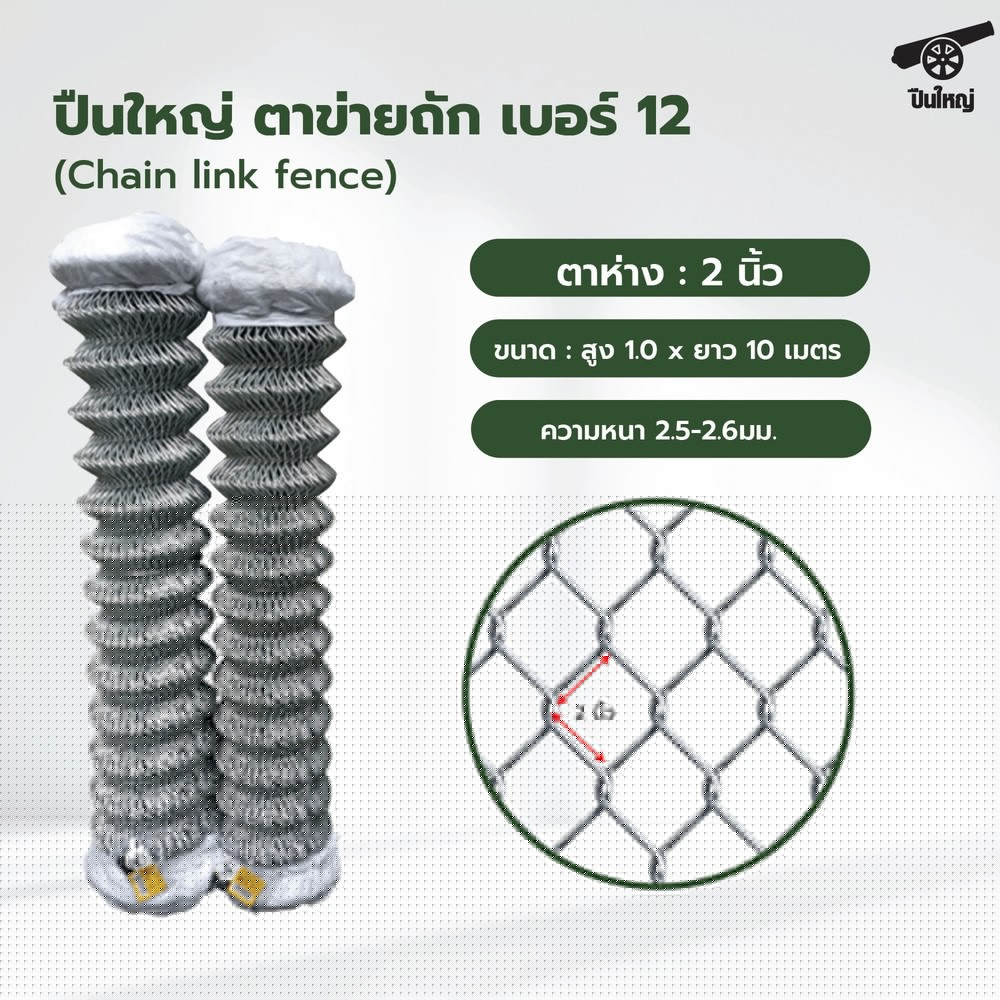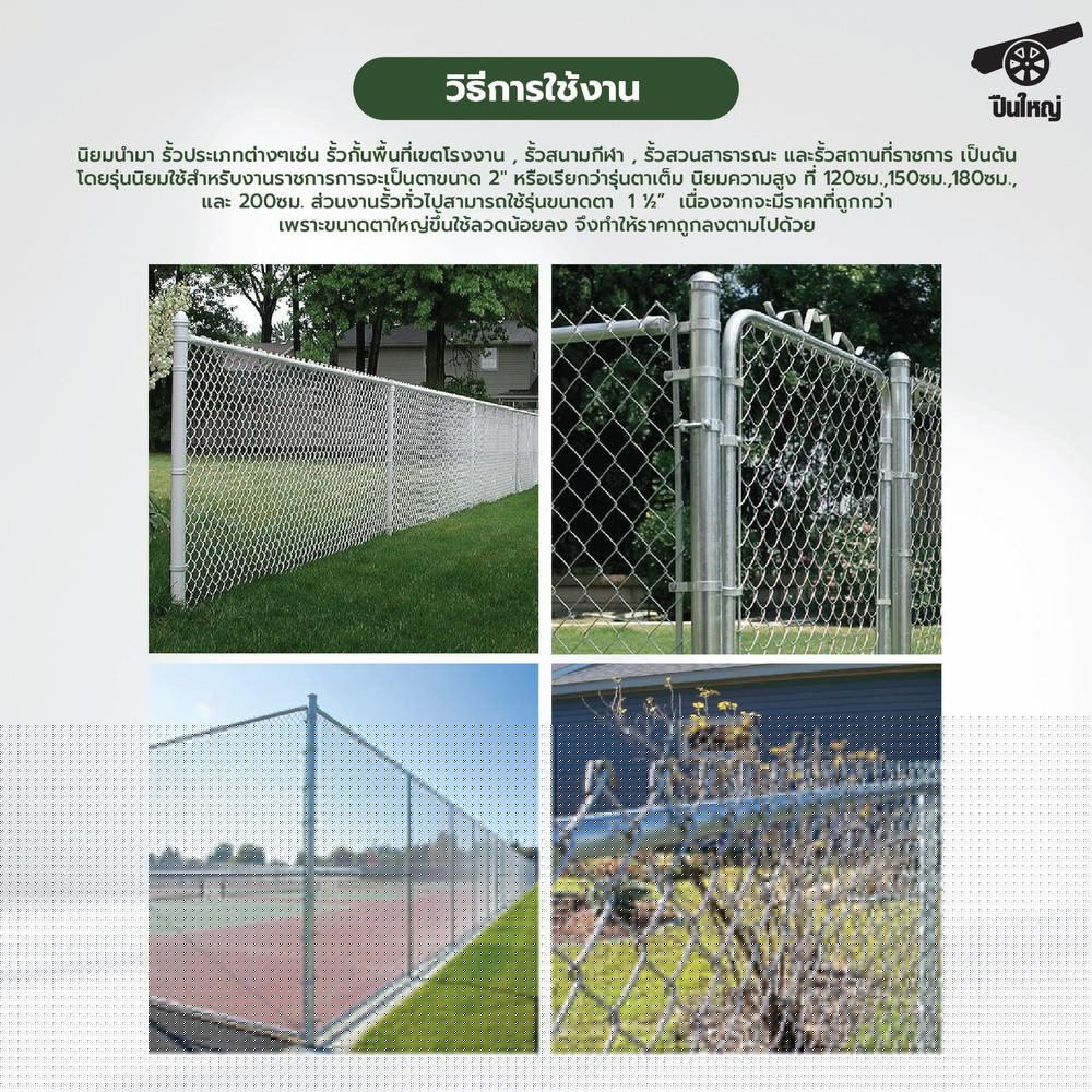 ปืนใหญ่ ตาข่ายถัก (Chain link fence) นิยมนำมาทำรั้วประเภทต่างๆเช่น รั้วกั้นพื้นที่เขตโรงงาน , รั้วสนามกีฬา , รั้วสวนสาธารณะ และรั้วสถานที่ราชการ เป็นต้น โดยรุ่นนิยมใช้สำหรับงานราชการการจะเป็นตาขนาด 2 หรือเรียกว่ารุ่นตาเต็ม นิยมความสูง ที่ 120ซม., 150ซม. , 180ซม. , และ 200ซม. ส่วนงานรั้วทั่วไปสามารถใช้รุ่นขนาดตา 1 ½” เนื่องจากจะมีราคาที่ถูกกว่า เพราะขนาดตาใหญ่ขึ้น ใช้ลวดน้อยลง จึงทำให้ราคาถูกลงตามไปด้วย.