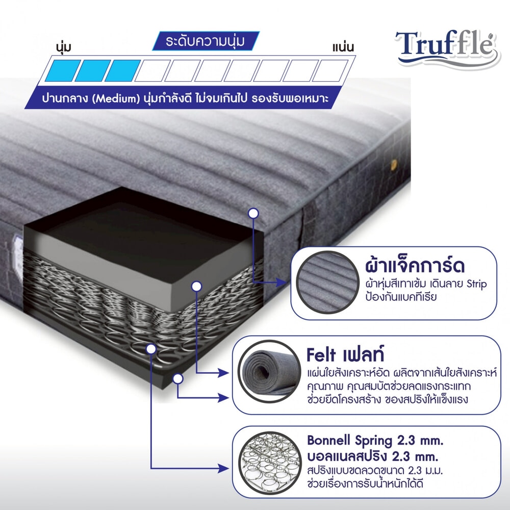 ชั้นที่ 1 และ 3 วัสดุ FELT แผ่นใยสังเคราะห์อัด ผลิตจากเส้นใยสังเคราะห์คุณภาพ คุณสมบัติช่วยลดแรงกระแทก ช่วยยึดโครงสร้างของสปริง ให้แข็งแรงขึ้น