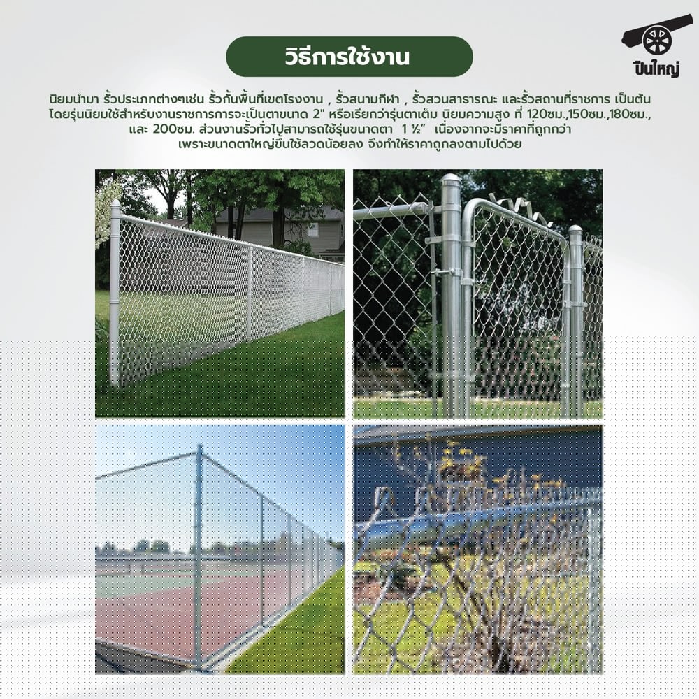ปืนใหญ่ ตาข่ายถัก (Chain link fence) นิยมนำมาทำรั้วประเภทต่างๆเช่น รั้วกั้นพื้นที่เขตโรงงาน , รั้วสนามกีฬา , รั้วสวนสาธารณะ และรั้วสถานที่ราชการ เป็นต้น โดยรุ่นนิยมใช้สำหรับงานราชการการจะเป็นตาขนาด 2 หรือเรียกว่ารุ่นตาเต็ม นิยมความสูง ที่ 120ซม., 150ซม. , 180ซม. , และ 200ซม. ส่วนงานรั้วทั่วไปสามารถใช้รุ่นขนาดตา 1 ½” เนื่องจากจะมีราคาที่ถูกกว่า เพราะขนาดตาใหญ่ขึ้น ใช้ลวดน้อยลง จึงทำให้ราคาถูกลงตามไปด้วย.ย