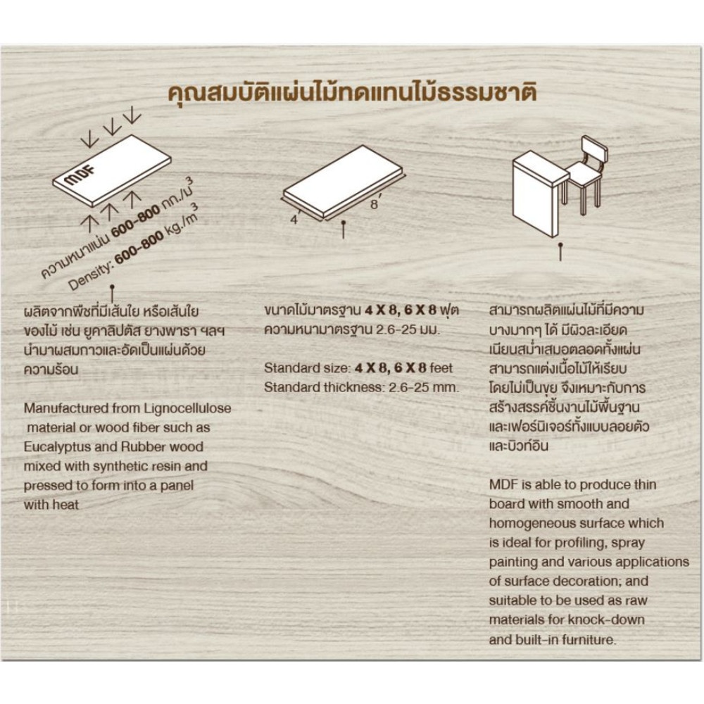 ให้คุณสมบัติด้านความแข็งแรง ทนทานต่อการขีดข่วน ต้านทานความชื้นและสารเคมี เหมาะสำหรับงานเฟอร์นิเจอร์ งานทำสี และ เซาะขึ้นรูป ตกแต่งภายใน