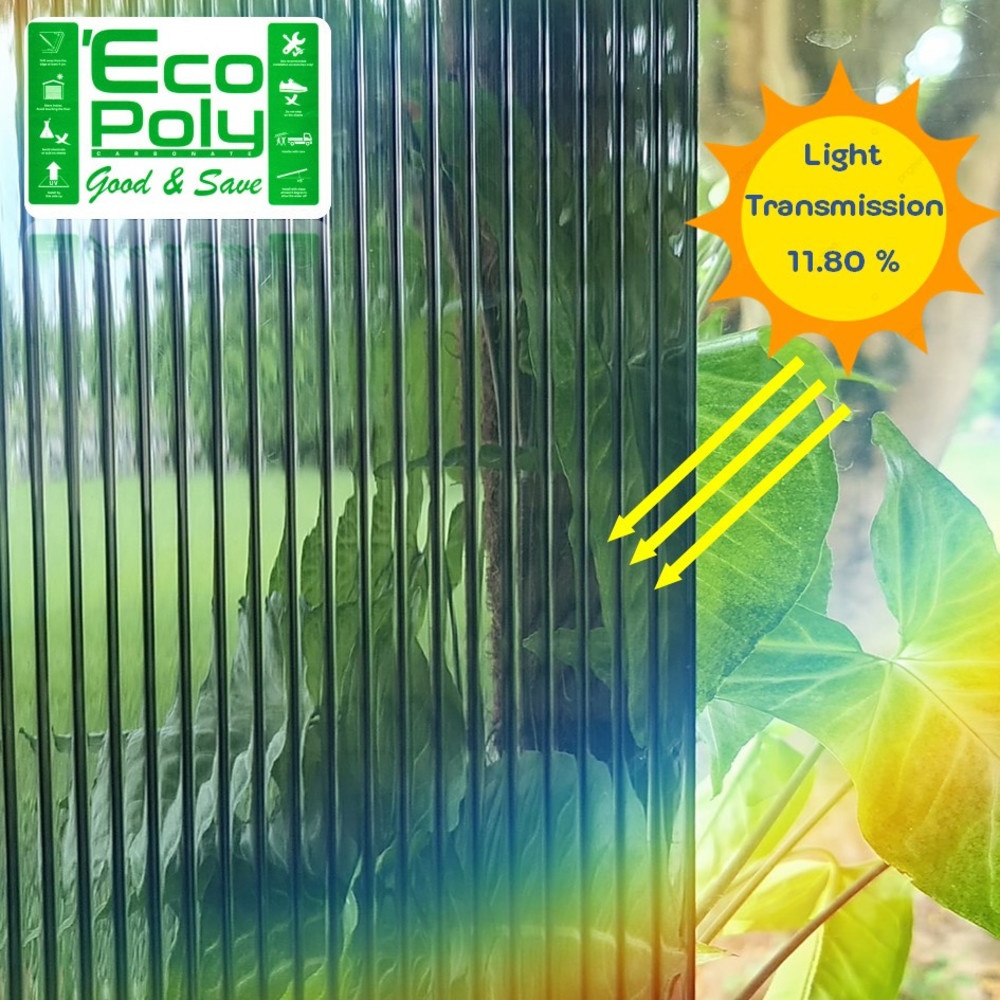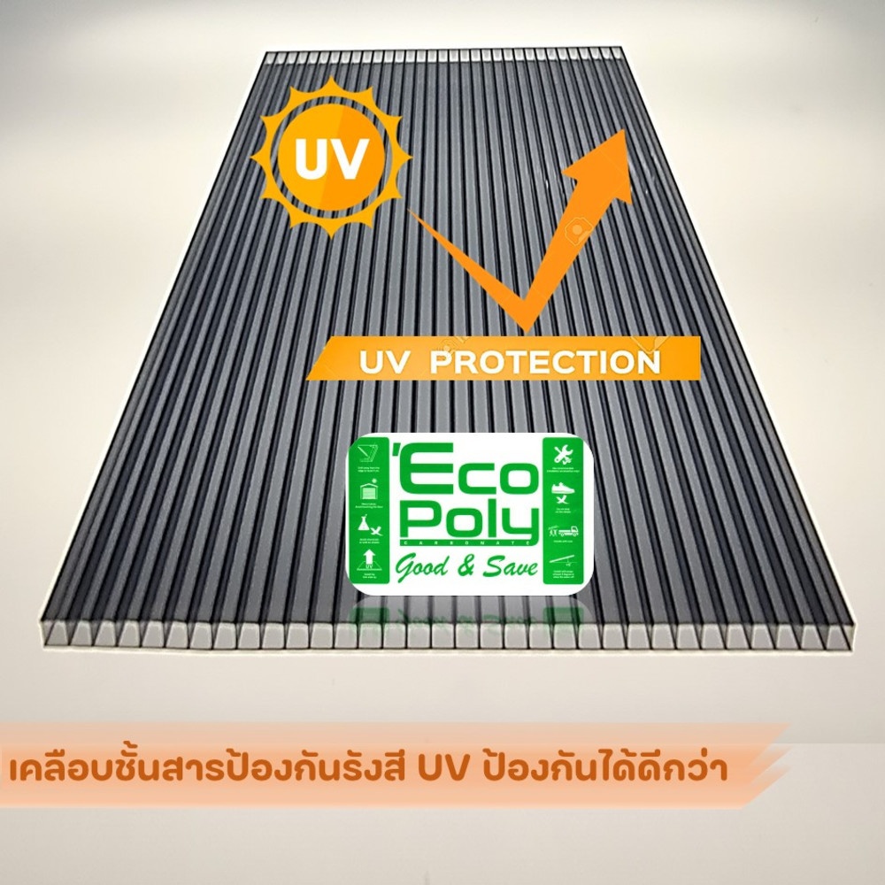 - วัสดุแผ่นมีความโปร่งแสง ผิวของแผ่นโพลีคาร์บอเนต เคลือบด้วยสารป้องกันรังสี UV ทนต่อสภาวะแวดล้อมได้ดี จึงสามารถใช้งานกลางแจ้งได้ยาวนาน