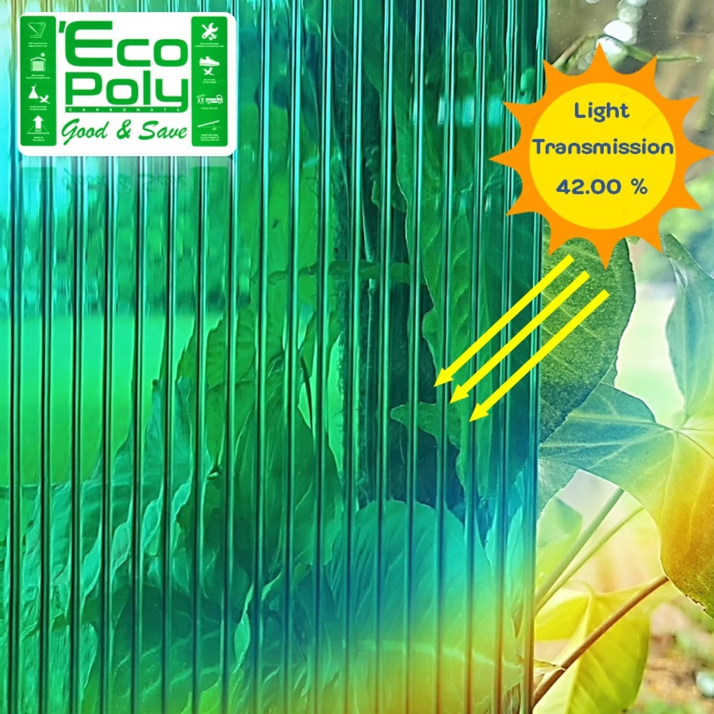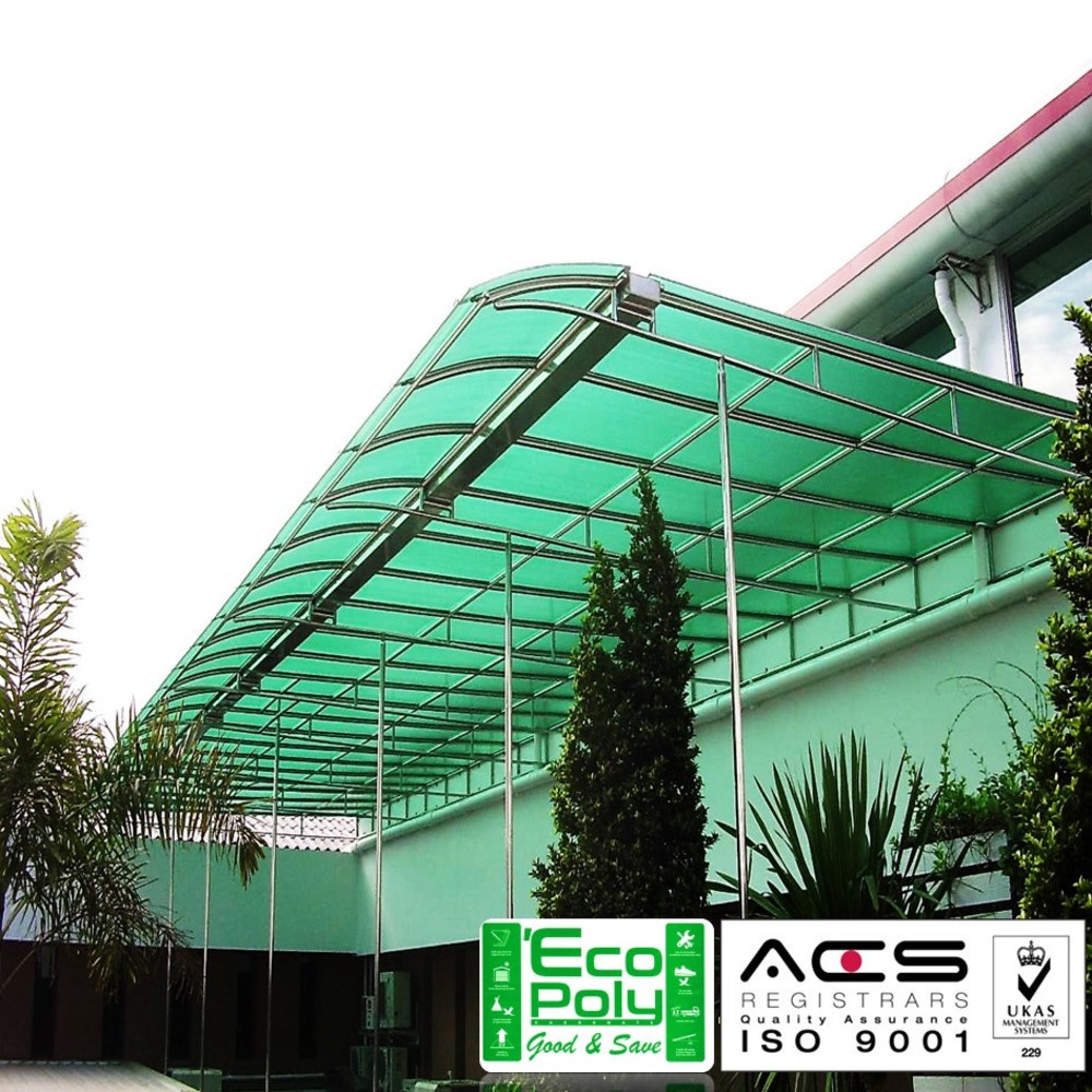 - วัสดุแผ่นมีความโปร่งแสง ผิวของแผ่นโพลีคาร์บอเนต เคลือบด้วยสารป้องกันรังสี UV ทนต่อสภาวะแวดล้อมได้ดี จึงสามารถใช้งานกลางแจ้งได้ยาวนาน