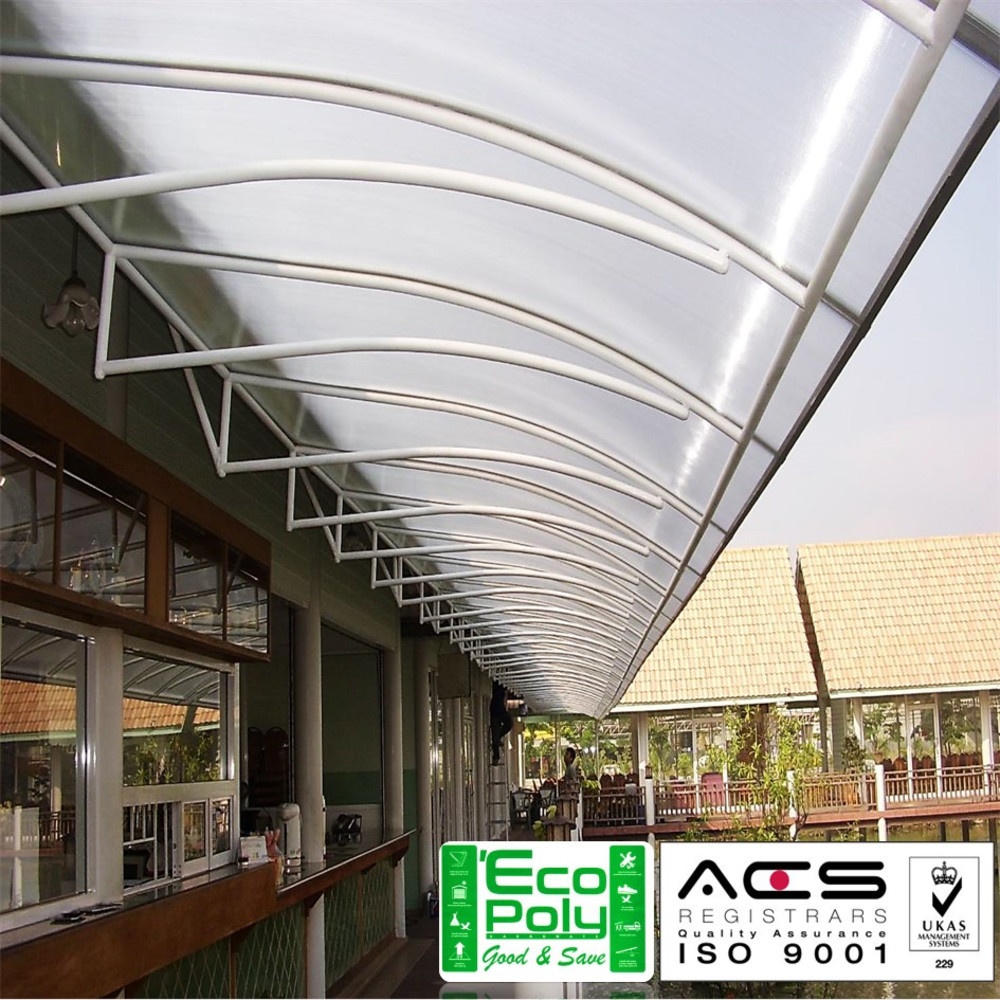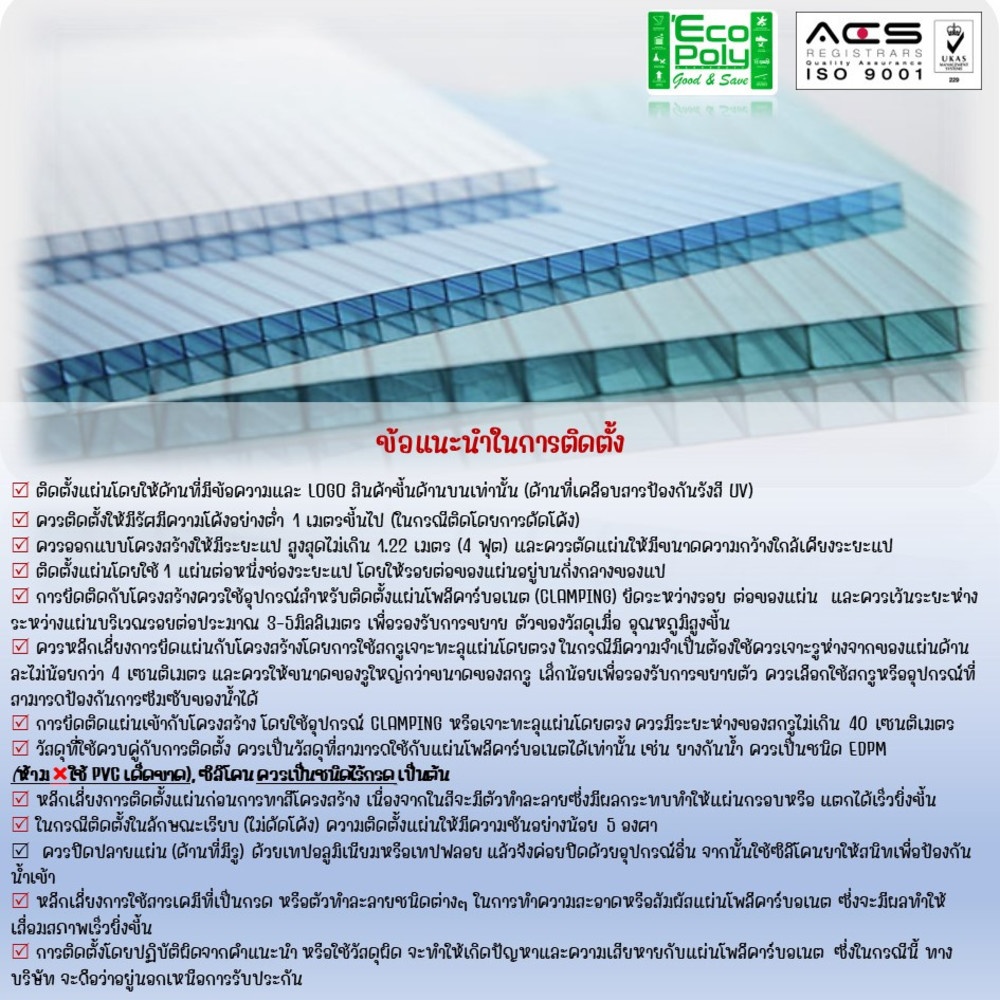 - วัสดุแผ่นมีความโปร่งแสง ผิวของแผ่นโพลีคาร์บอเนต เคลือบด้วยสารป้องกันรังสี UV ทนต่อสภาวะแวดล้อมได้ดี จึงสามารถใช้งานกลางแจ้งได้ยาวนาน