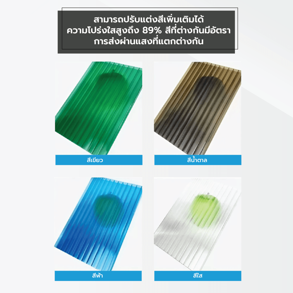 แผ่นโพลีคาร์บอเนต รุ่น Hollow (ผิวเรียบ) ผลิตตามมาตรฐานทั่วไป ผลลัพธ์การใช้งานขึ้นอยู่กับการติดตั้งและดูแลรักษาของผู้ใช้งาน