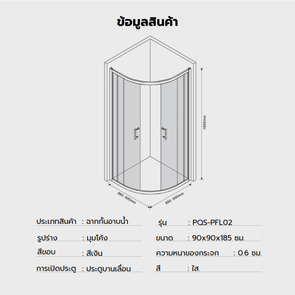 Heritage ฉากกั้นอาบน้ำแบบบานเลื่อนเข้ามุมโค้ง ขนาด 90x90x185 ซม. รุ่น PQS-PFL02