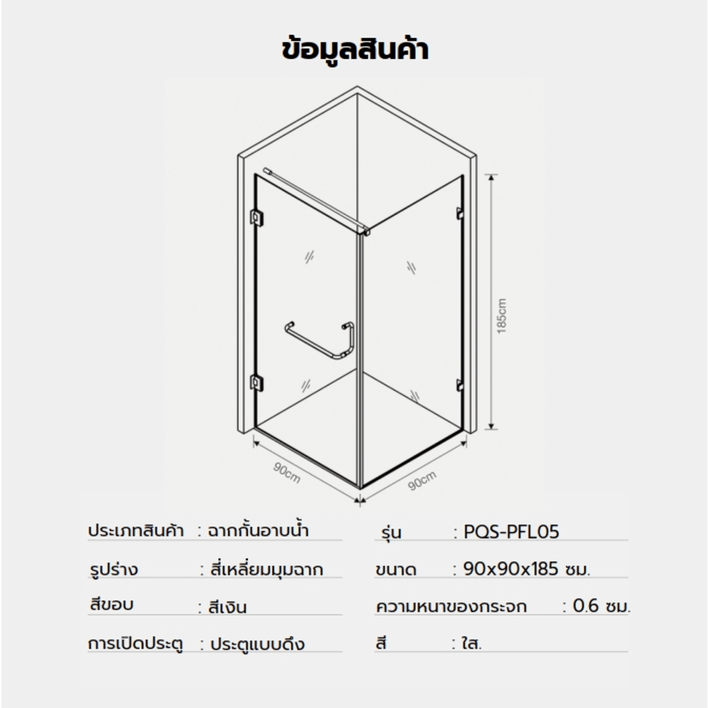 Heritage ฉากกั้นอาบน้ำแบบบานเปิดเข้ามุมฉาก ขนาด 90x90x185 ซม. รุ่น PQS-PFL05