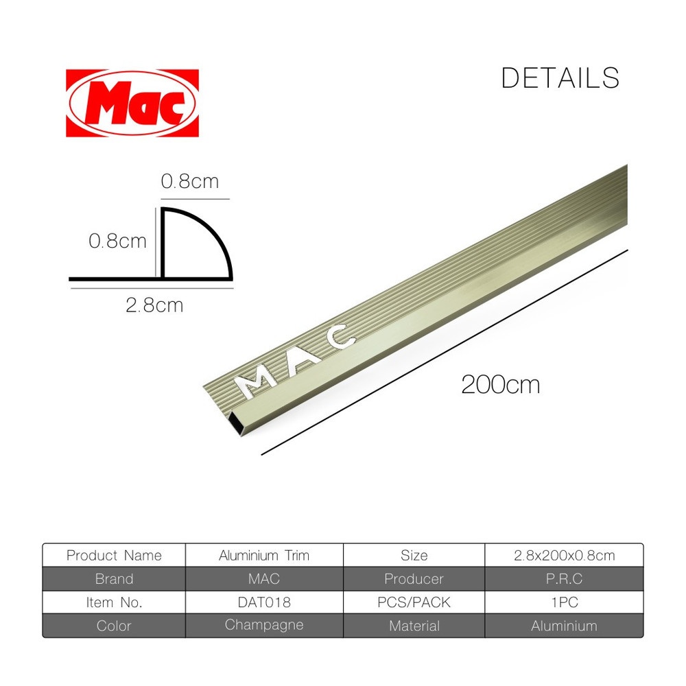 MAC คิ้วอลูมิเนียม แบบเหลี่ยม ขนาด 8 มม. ยาว 2 เมตร. รุ่นDAT018 สีแชมเปญ