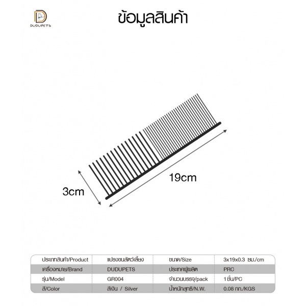 1แปรงขนสัตว์เลี้ยง รุ่น GR004 ขนาด 3x19x0.3ซม. สีเงิน