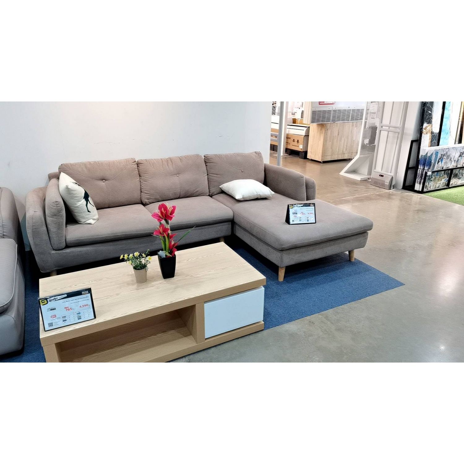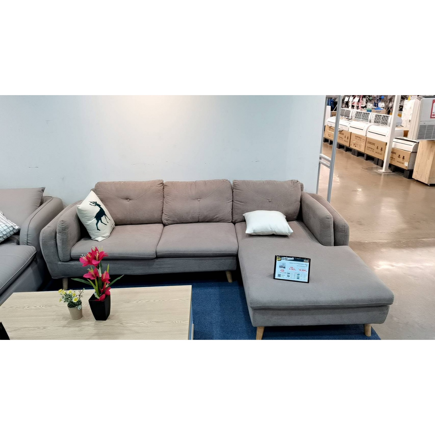 โซฟาห้องนั่งเล่น รูปทรงตัว L เข้ามุมด้านขวา ช่วยประหยัดพื้นที่ใช้สอยในบ้าน