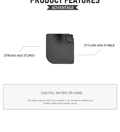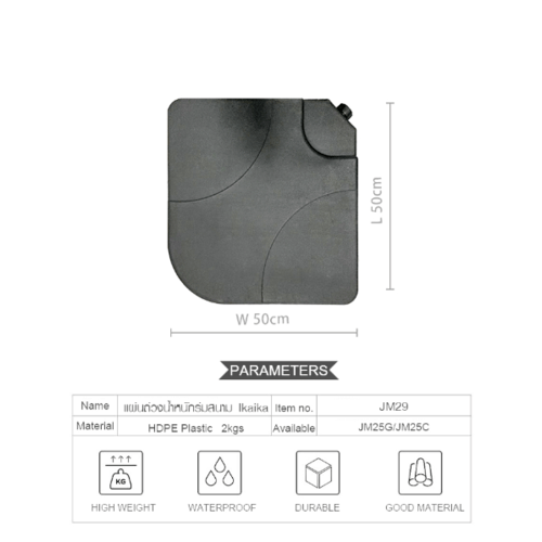 แผ่นถ่วงน้ำหนักร่มสนาม ตัวช่วยในการถ่วงน้ำหนักของขาตั้งร่ม เพื่อให้ร่มมีความมั่งคง ไม่เอนไปมา ผลิตจากวัสดุคุณภาพดีมีความแข็งแรง กรอบแตกยาก ใช้งานได้ง่าย สามารถใส่น้ำหรือทรายเพื่อเพิ่มน้ำหนัก น้ำหนักเบาเคลื่อนย้ายสะดวก
