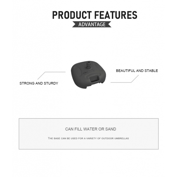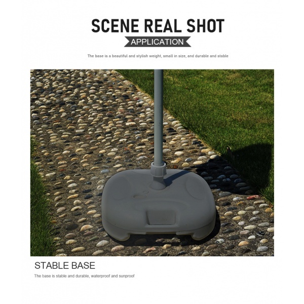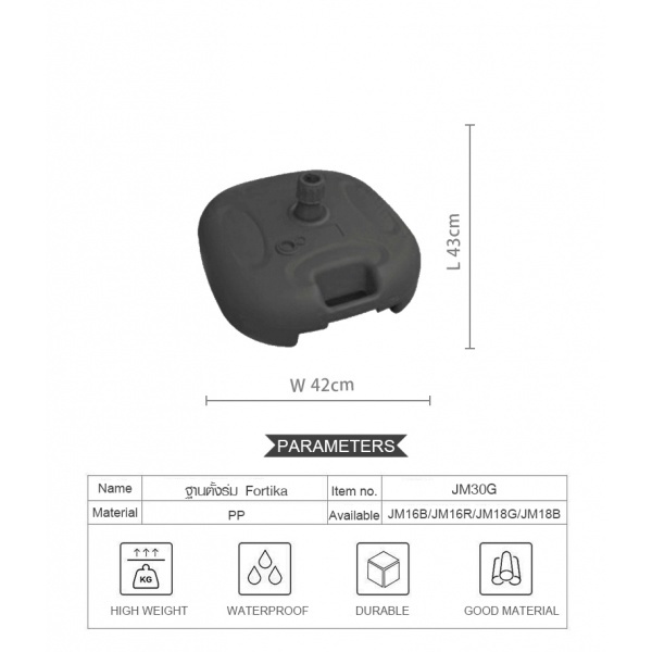 ฐานตั้งร่ม ผลิตจากพลาสติกหล่อคุณภาพดี แข็งแรง ทนทานต่อการใช้งาน ดีไซน์สวยงามทันสมัย เคลื่อนย้ายได้สะดวก ใช้งานได้ง่าย ใช้ได้กับร่มหลากหลายรูปแบบ ทั้งร่มสนาม ร่มชายหาด หรือร่มแม่ค้า มีช่องสำหรับใส่ขาร่ม และน็อตสำหรับขันให้ฐานร่มและขาร่มยึดกันแน่นขึ้น