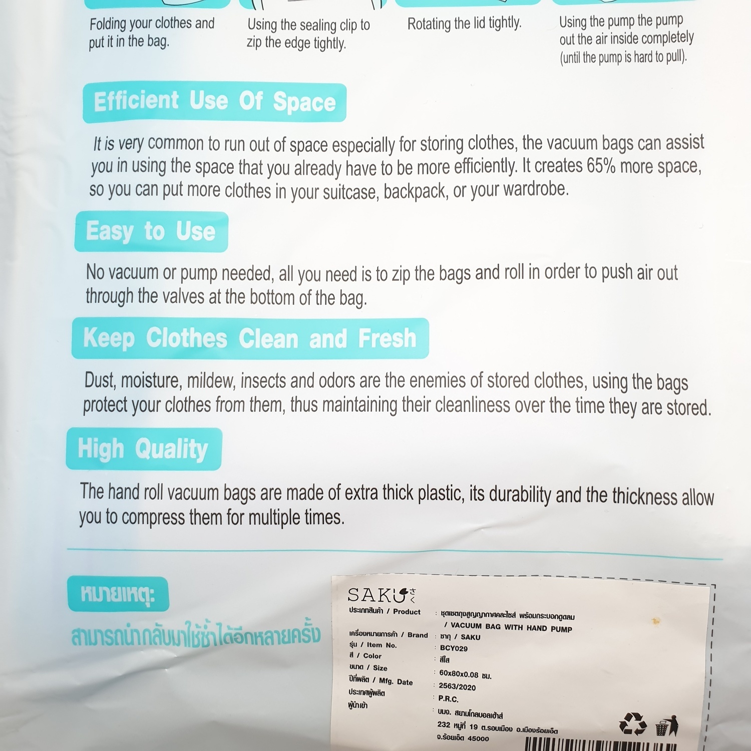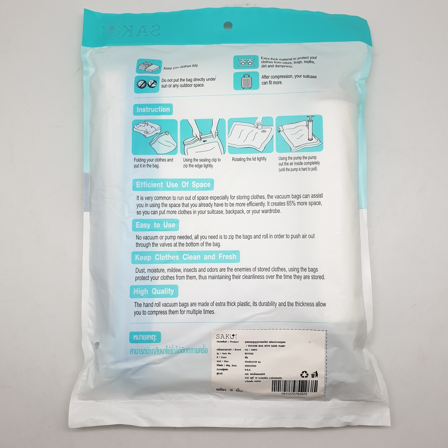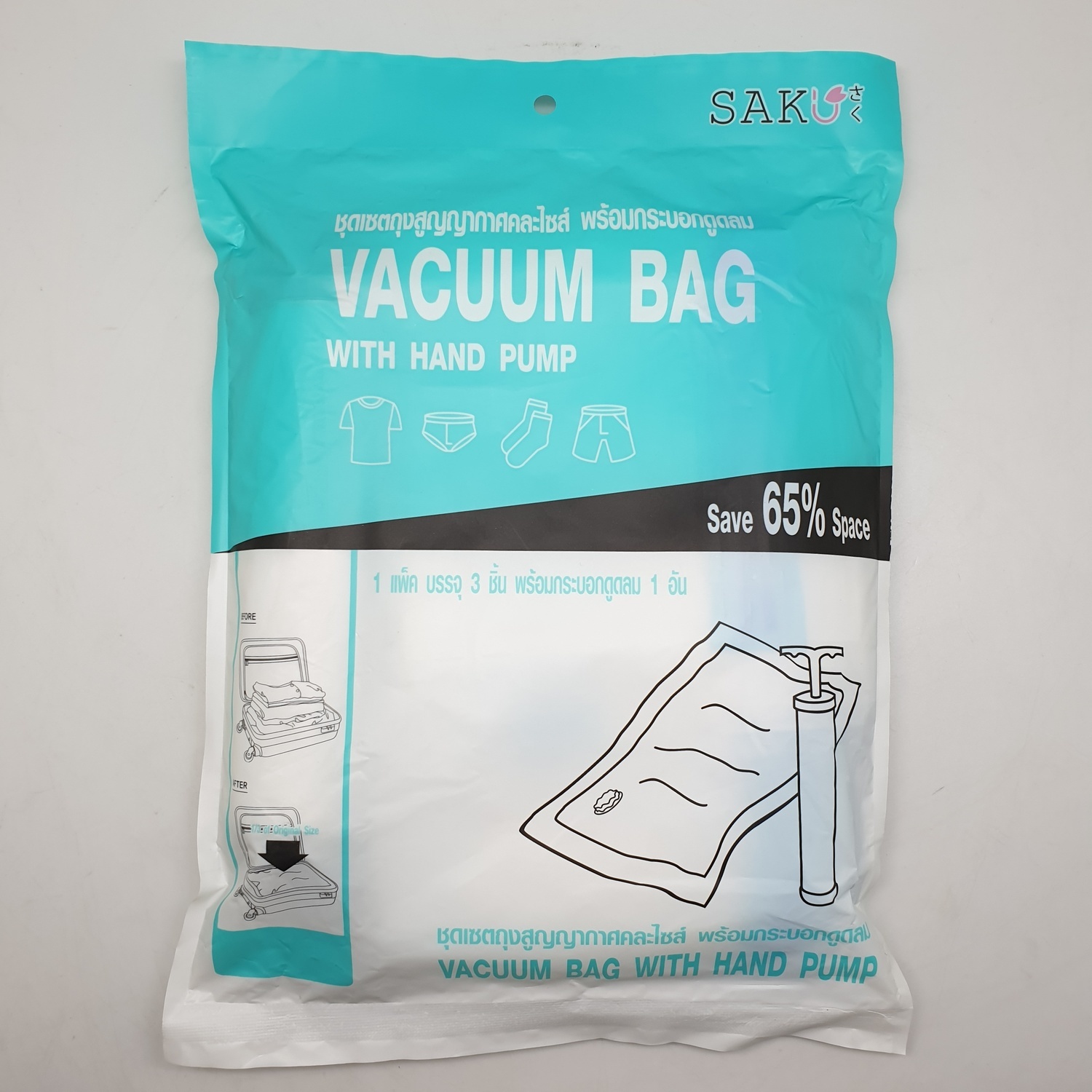 SAKU ถุงสูญญากาศ BCY029 ขนาด 60x80x0.08ซม. สีใส แพ็ค 3 ชิ้น พร้อมกระบอกดูดลม
