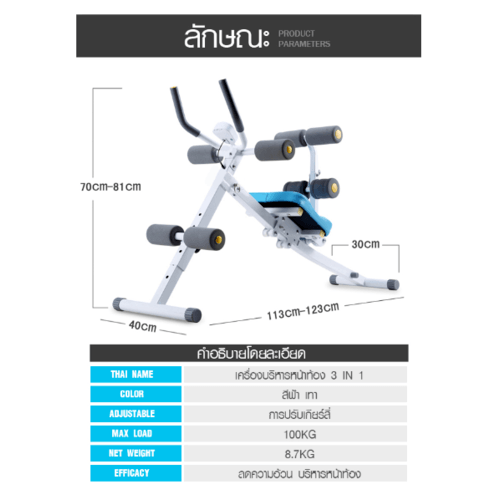 4TEM เครื่องบริหารหน้าท้อง 3 IN 1 ขนาด 48×118×72ซม. สีฟ้า เทา รองรับน้ำหนักสูงสุด 100 กิโลกรัม