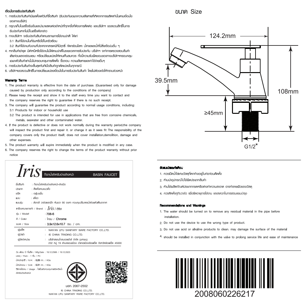 Iris ก๊อกอ่างล้างหน้าทรงเตี้ย รุ่น ฟรอส 708-6