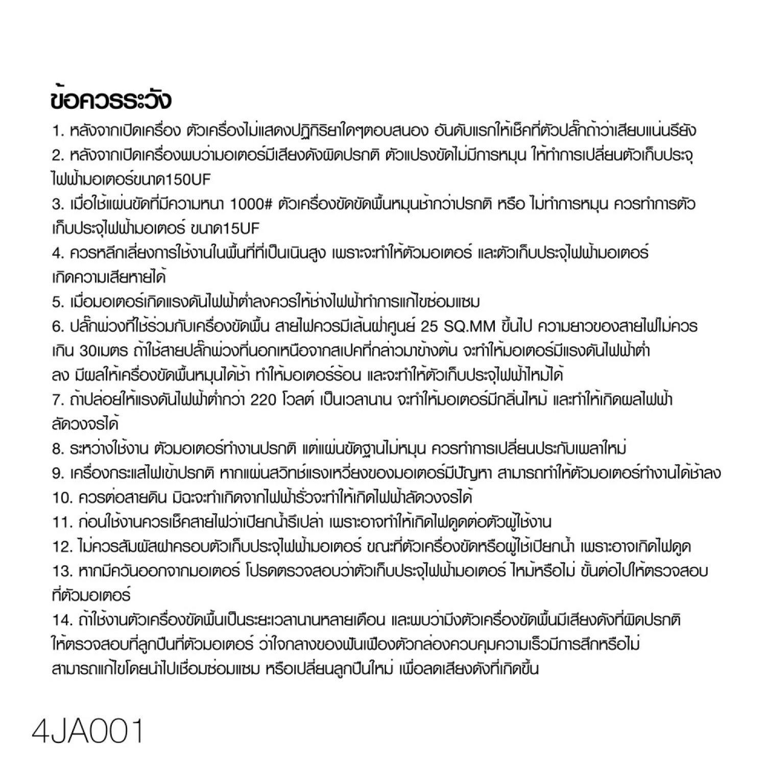 2. การรับประกันจะไม่รวมถึง การใช้งานผิดประเกท, ความเสียหายจากการขนส่ง, การละทิ้งจนทำให้เกิดความเสียหาย, อุบัติเหตุทุกประเภท, ความประมาทเลินเล่อ, ความเสียหายจากการตกน้ำ, ภัยธรรมชาติ, การซ่อมแซมโดยบุคคลที่ไม่มีความชำนาญ หรือใช้ในสภาพกระแสไฟฟ้าไม่ปกติ เป็นต้น และการรับประกันนี้ไม่รวมถึงแผ่นขัด หรือจานจับแผ่นขัด