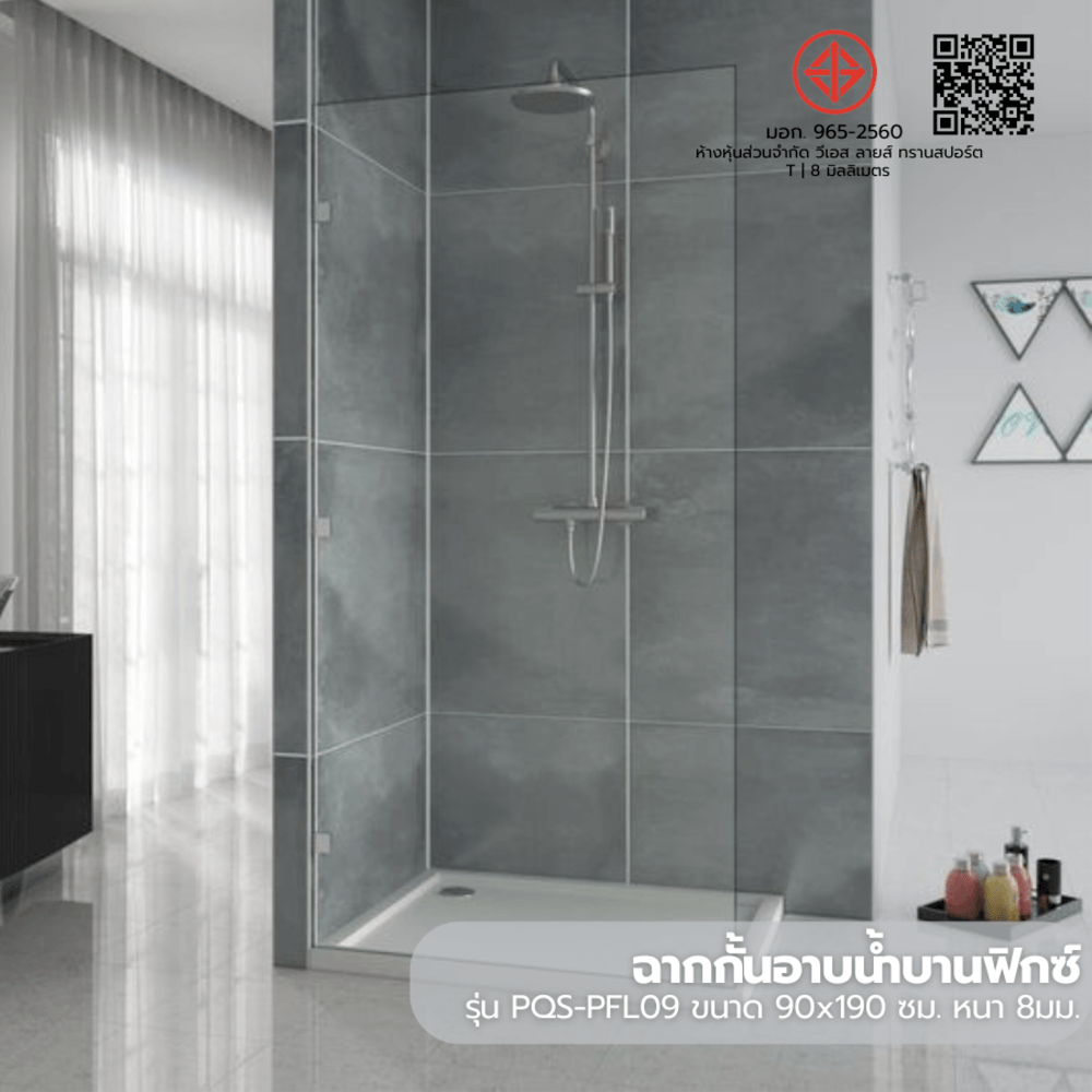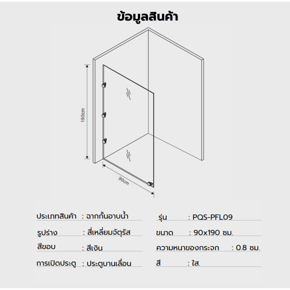Heritage ฉากกั้นอาบน้ำบานฟิกซ์ ขนาด 90x190 ซม. หนา 8มม. รุ่น PQS-PFL09