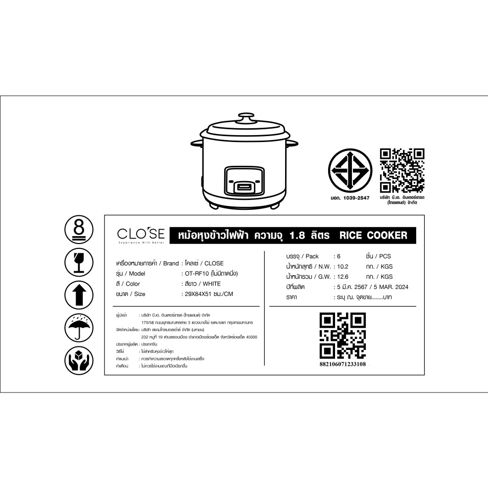 | รุ่น | OT-RF10 (ไม่มีถาดนึ่ง) |
