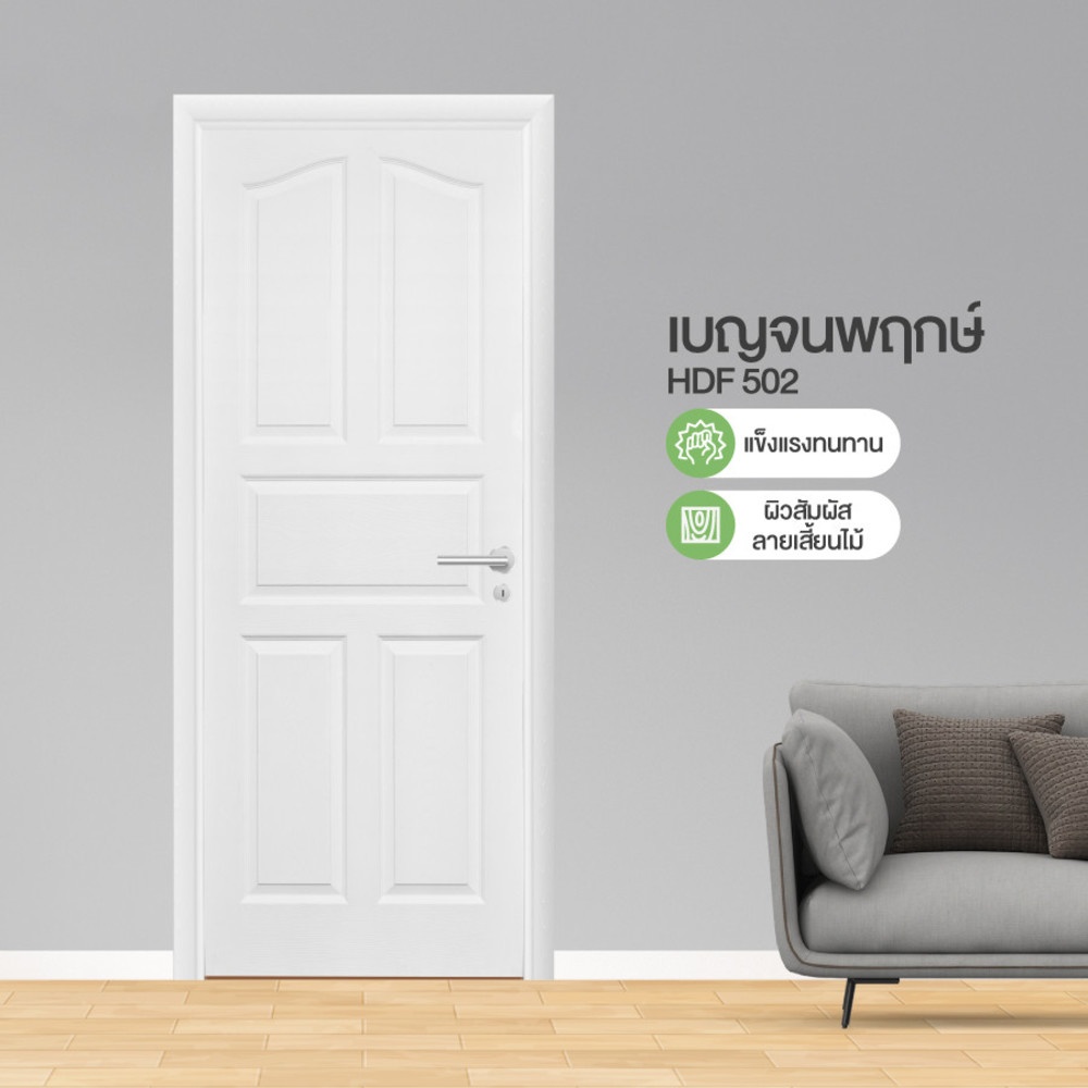- บานประตูสีขาวพร้อมติดตั้ง เสริมลูกเล่นด้วยผิวสัมผัสลายเสี้ยนไม้ ให้ความรู้สึกเหมือนลายไม้ธรรมชาติ