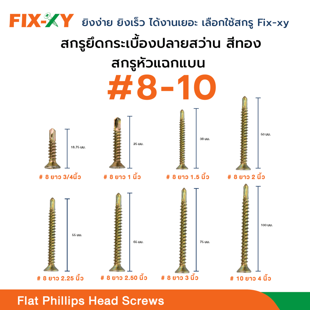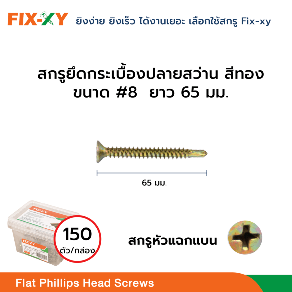 FIX-XY สกรูยึดกระเบื้องปลายสว่าน สะดวก รวดเร็ว เนื่องจากมีปลายสว่านในตัว ทำให้ไม่ต้องเจาะรูนำ ช่วยประหยัดเวลาและแรงงาน แข็งแรง ทนทาน ผลิตจากวัสดุคุณภาพสูง มีความแข็งแรงทนทาน สามารถรับน้ำหนักได้ดี ติดตั้งง่าย เพียงใช้เครื่องมือไฟฟ้าในการขันสกรู ก็สามารถติดตั้งได้อย่าง หลากหลายขนาดมีให้เลือกหลายขนาดและความยาว เพื่อให้เหมาะสมกับการใช้งานที่แตกต่างกันรวดเร็ว