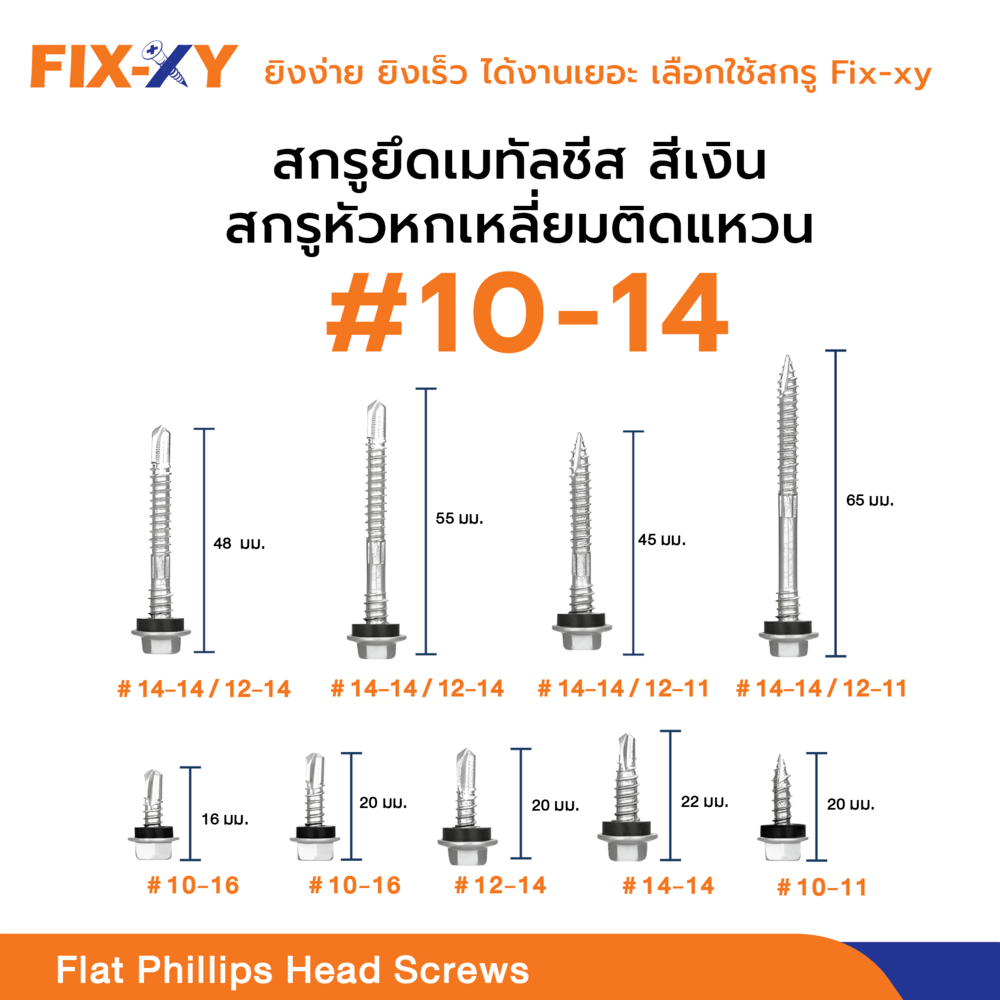 FIX-XY สกรูยึดเมทัลชีท หัวสกรูส่วนใหญ่จะมีลักษณะเป็นหัวเวเฟอร์ (Wafer Head) หรือหัวหกเหลี่ยม (Hex Head) ซึ่งออกแบบมาให้จับยึดกับหัวบล็อกได้แน่น ทำให้ขันสกรูได้ง่ายและไม่ลื่น ปลายสกรูมักจะเป็นปลายสว่าน (Drill Point) และปลายแหลม ที่มีความคม ทำให้สามารถเจาะทะลุแผ่นเมทัลชีทได้โดยไม่ต้องเจาะนำ ช่วยให้การติดตั้งรวดเร็วและสะดวกยิ่งขึ้น