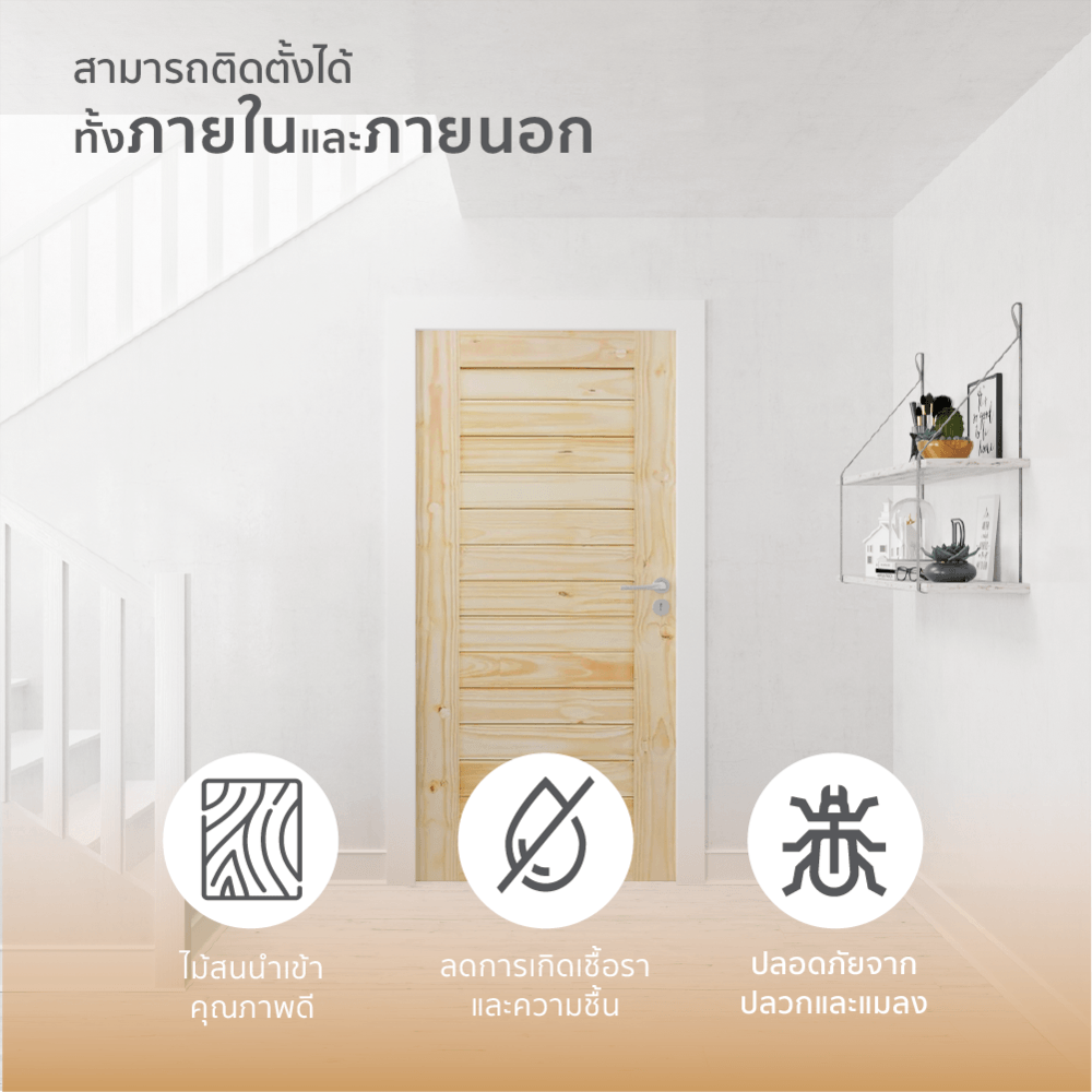 - บานประตูไม้สามารถติดตั้งกับวงกบไม้จริง หรือวงกบไม้สังเคราะห์ได้