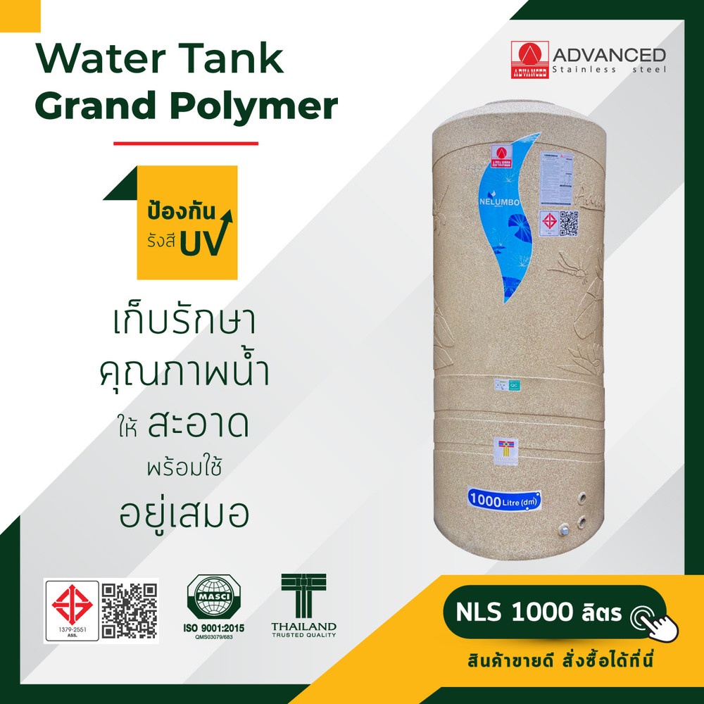 1. ถังเก็บน้ำบนดิน Advanced ผลิตจากวัตถุดิบที่มีคุณภาพ จึงมั่นใจในการนำมาใช้บรรจุน้ำธรรมดา ไม่เกิดตะไคร่ น้ำ ไม่มีสารตกค้าง ปลอดภัยได้น้ำสะอาด และไม่เป็นอันตรายต่อสุขภาพ