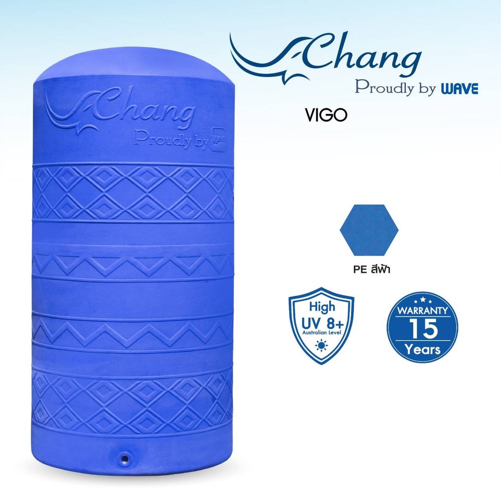 ถังเก็บน้ำบนดิน WAVE Vigo วีโก้ ผลิตจากพลาสติกโพลิเมอร์ชนิด C6 ที่มีความแข็งแรงทนทานกว่า C4 ถึง 20 เท่า ใช้สำรองน้ำอุปโภค และบริโภค ทั้งยังไร้กลิ่นไม่พึงประสงค์ โดยถังมีลักษณะทึบแสงจึงป้องกันการเกิดตะไคร่ได้ดี ฝาถังปิดสนิท อากาศไม่เข้า พร้อมคุณสมบัติป้องกันแสงแดดถังไม่ซีดจางด้วย UV ระดับ 8 รับประกันยาวนานถึง 15 ปี* ตามเงื่อนไขรับประกันของบริษัทกำหนด