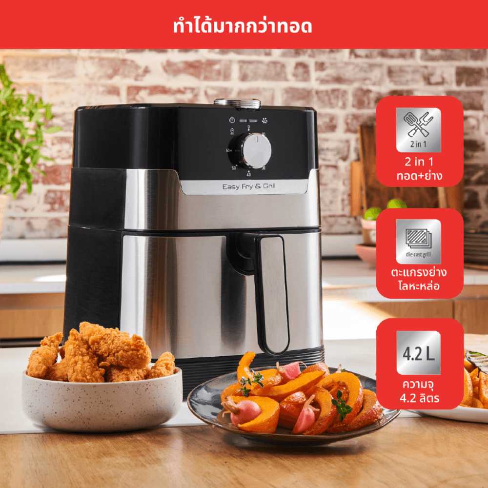 ให้คุณเพลิดเพลินกับการทำอาหารเพื่อสุขภาพแบบเน้นๆ หม้อทอดไร้น้ำมัน Tefal Easy Fry & Grill Classic ที่สามารทอดและย่างได้ในเครื่องเดียว เป็นการผสานหม้อทอดไร้น้ำมันกับเตาปิ้งย่างไว้ในเครื่องเดียว เพื่อการทอดอาหารที่ดีต่อสุขภาพโดยใช้น้ำมันเพียงเล็กน้อยหรือไม่ใช้เลย และการย่างอาหารแบบไร้ที่ติ แต่สะดวกสบายยิ่งขึ้น มาพร้อม ตัวตะแกรงโลหะหล่อ (Die Cast) ใช้งานได้ 2in1 ทอด+ย่าง ให้คุณย่างเนื้อได้นุ่มชุ่มฉ่ำ ไร้ควันรบกวน ควบคุมการทำงานด้วยระบบปุ่มหมุน ปรับอุณหภูมิได้ตั้งแต่ 80-200 องศาเซลเซียส เคลือบสารกันติด ทำความสะอาดง่าย ไม่ติดหม้อและตะแกรง