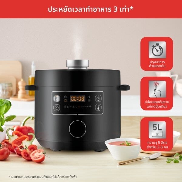 ให้คุณใช้งานได้อย่างสะดวกสบาย ด้วยหม้ออัดแรงดันไฟฟ้าที่มี-กำลังไฟ 1,090 วัตต์ ความจุทั้งหมด 5 ลิตร ความจุใช้งาน 3.2 ลิตร สำหรับทำอาหารได้สำหรับ 2-3 คน ทำอาหารได้รวดเร็วและหลากหลาย จะต้มผัดแกงตุ๋นหรือหุงข้าว ก็ทำได้ในหม้อเดียว เทคโนโลยีทำอาหารด้วยแรงดันที่มีความปลอดภัยสูง สูงสุด 70 kPa ปรุงอาหารอร่อยได้ในเวลาไม่นาน หมดกังวลเรื่องปล่อยแรงดัน ให้คุณกดปล่อยแรงดันได้ง่ายๆ ในปุ่มเดียว โดยไม่ต้องกดค้าง ปุ่มปล่อยแรงดันอยู่ห่างจากวาล์วปล่อยแรงดัน ปลอดภัยยิ่งขึ้น ลดโอกาสไอน้ำร้อนโดนมือ ใช้งานง่าย แม้คนทำอาหารไม่เป็น