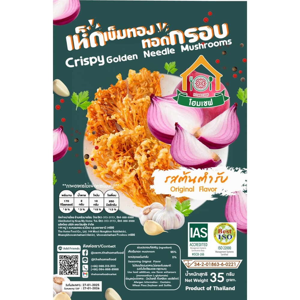 กรอบ อร่อย ทานเพลิน ได้รสชาติความหอมของเห็ดเข็มทองแท้ ๆ ผสมผสานกับเครื่องปรุงรสสูตรเฉพาะของโฮมเชฟ ปรุงมาอย่างลงตัว